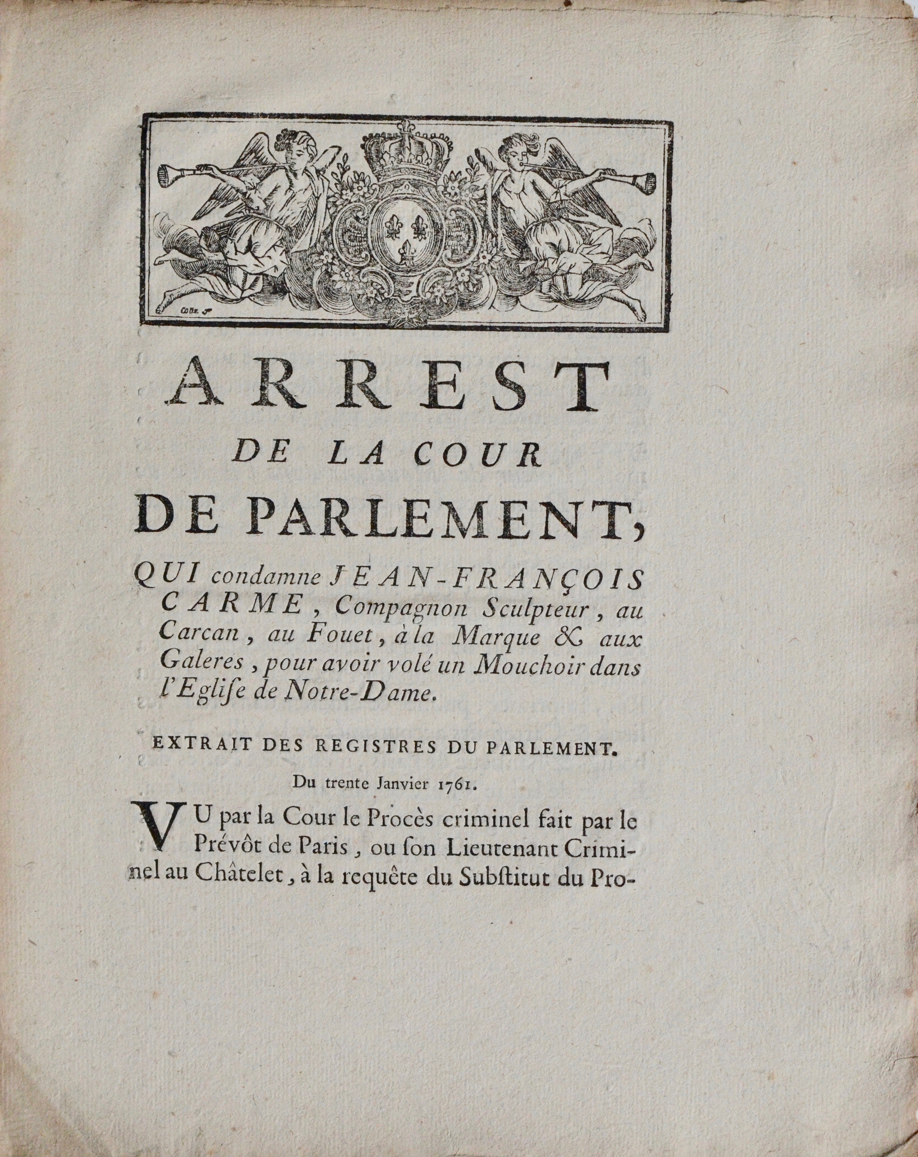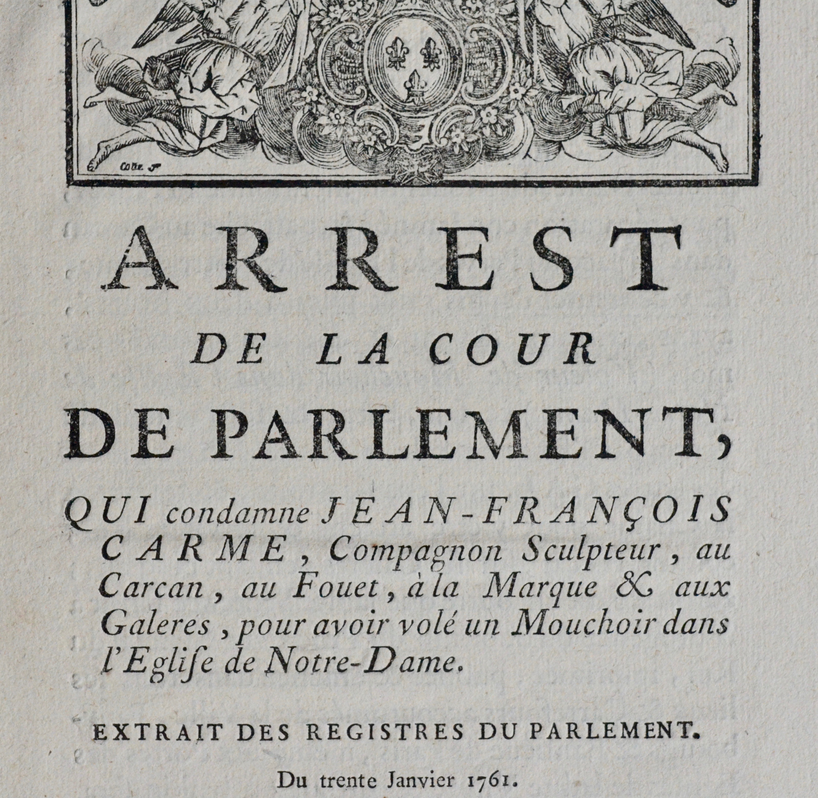 "Arrest de la cour de parlement qui condamne Jean-François Carme, compagnon sculpteur, au Carcan, au Fouet, à la Marque & aux Galères, pour avoir volé un Mouchoir dans l'Eglise de Notre-Dame".