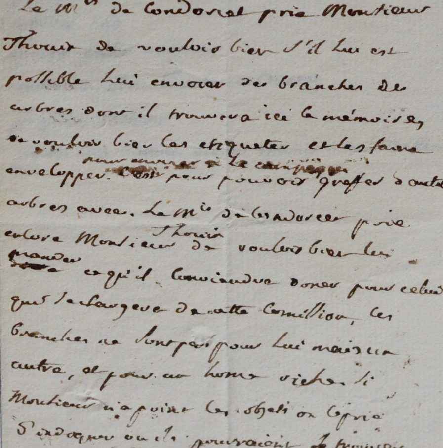 "Le Mis de Condorcet prie Monsieur Thouin de vouloir bien s'il lui est possible lui envoyer des branches des arbres dont il trouvera ici le mémoire, de vouloir bien les étiqueter et les faire envelopper pour oeuvrer à la campagne. C'est pour pouvoir greffer à autres arbres avec. Le Mis de Condorcet prie encore Monsieur Thouin de vouloir bien lui mander ce qu'il conviendra donner pour celui qui se chargera de cette commission, ces branches ne sont pas pour lui mais un autre, et pour un homme riche. Si Monsieur n'a point ces objets on le prie d'indiquer où ils pourraient le trouver".