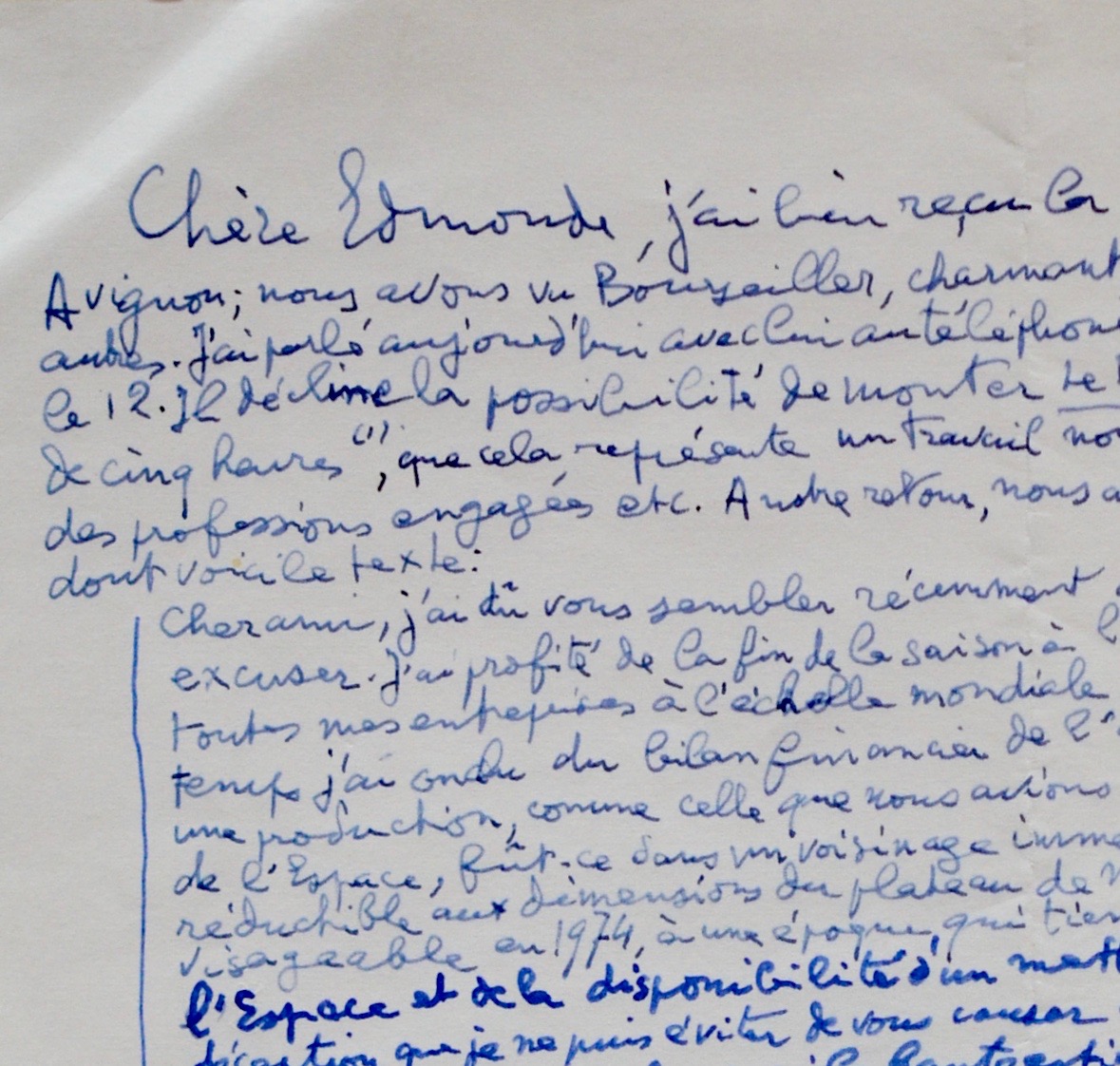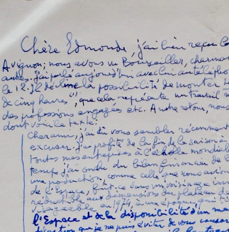 Louis Aragon (Paris, 1897/1982)Belle lettre d'Aragon adressée à Edmonde Charles-Roux, relative à ses déboires concernant son projet d'adaptation théâtrale du fameux poème Le Fou d'Elsa. Aragon explique avoir vu Antoine Bourseiller, en Avignon : "J'ai parlé aujourd'hui avec lui au téléphone, après qu'il ait lu le manuscrit porté le 12. Il décline, la possibilité de monter Le Fou : estimant que cela ferait un spectacle de 5 heures, que cela représente un travail non de metteur en scène, mais de coordinateur de professions engagées [...]". À son retour à Toulon, il dit avoir reçu une longue lettre de Pierre Cardin, qu'il retranscrit en partie : le bilan financier de l'Espace Cardin le force lui-même à renoncer à la production du Fou d'Elsa, mais il peut envisager pour 1974 une transposition scénique du poème réduite aux dimensions du plateau du théâtre, mais sous certaines conditions.