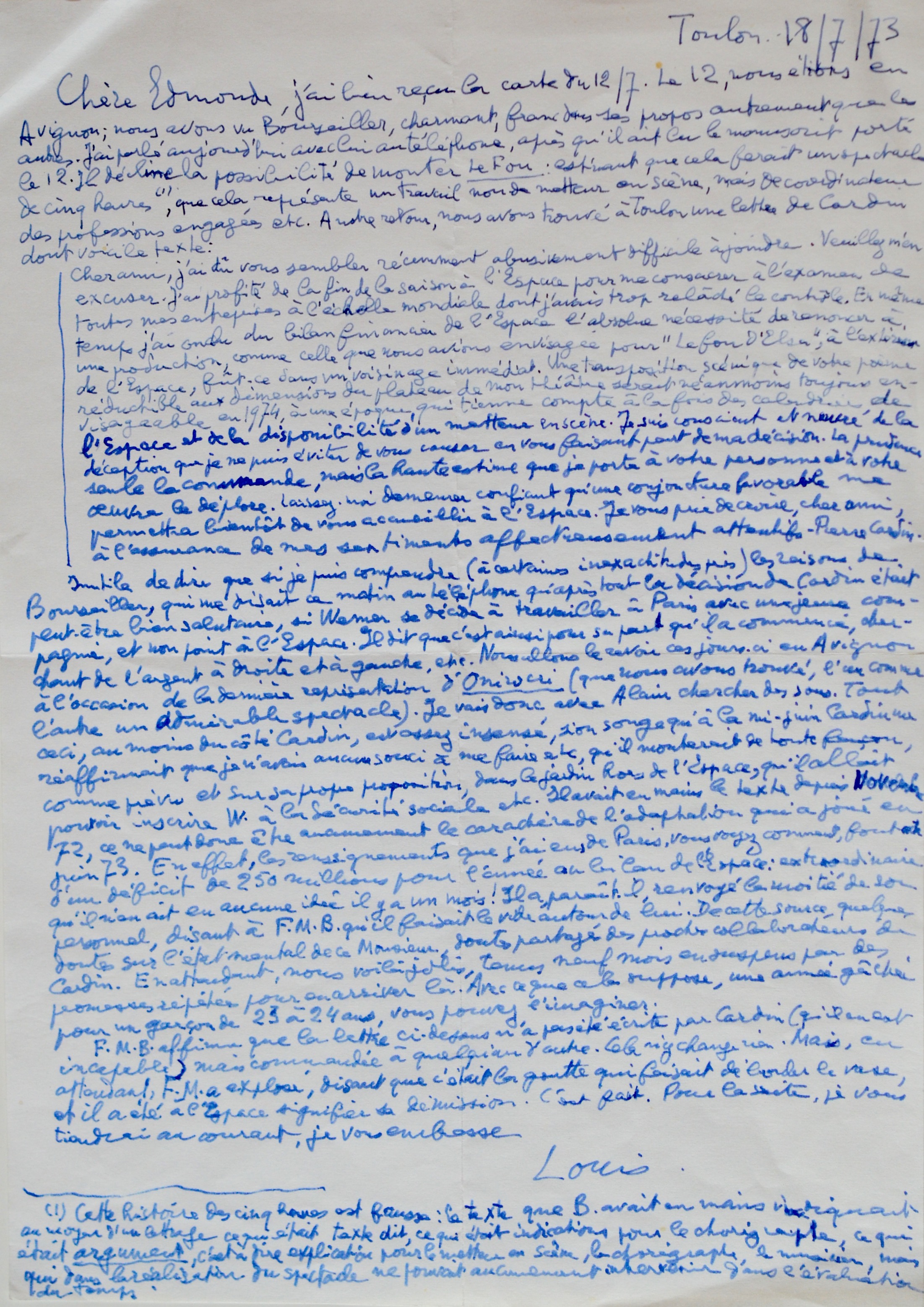 Les arguments de Cardin lui paraissent insensés : "si on songe qu'à la mi-juin Cardin me réaffirmait que je n'avais aucun souci à me faire etc, qu'il monterait de toute façon, comme prévu et sur sa propre proposition, dans le jardin hors l'Espace [...] Il avait en mains le texte depuis novembre 72". Les renseignements qu'Aragon a obtenu à ce sujet font état "d'un déficit de 250 millions pour l'année au bilan de l'Espace : extraordinaire qu'il n'en ait eu aucune idée il y a un mois !". Il soupçonne donc Cardin de lui avoir menti, d'autant qu'il a appris qu'il avait renvoyé la moitié de son personnel. "En attendant, nous voila jolis, tenus neuf mois en suspens par des promesses répétées pour en arriver là. [...]"