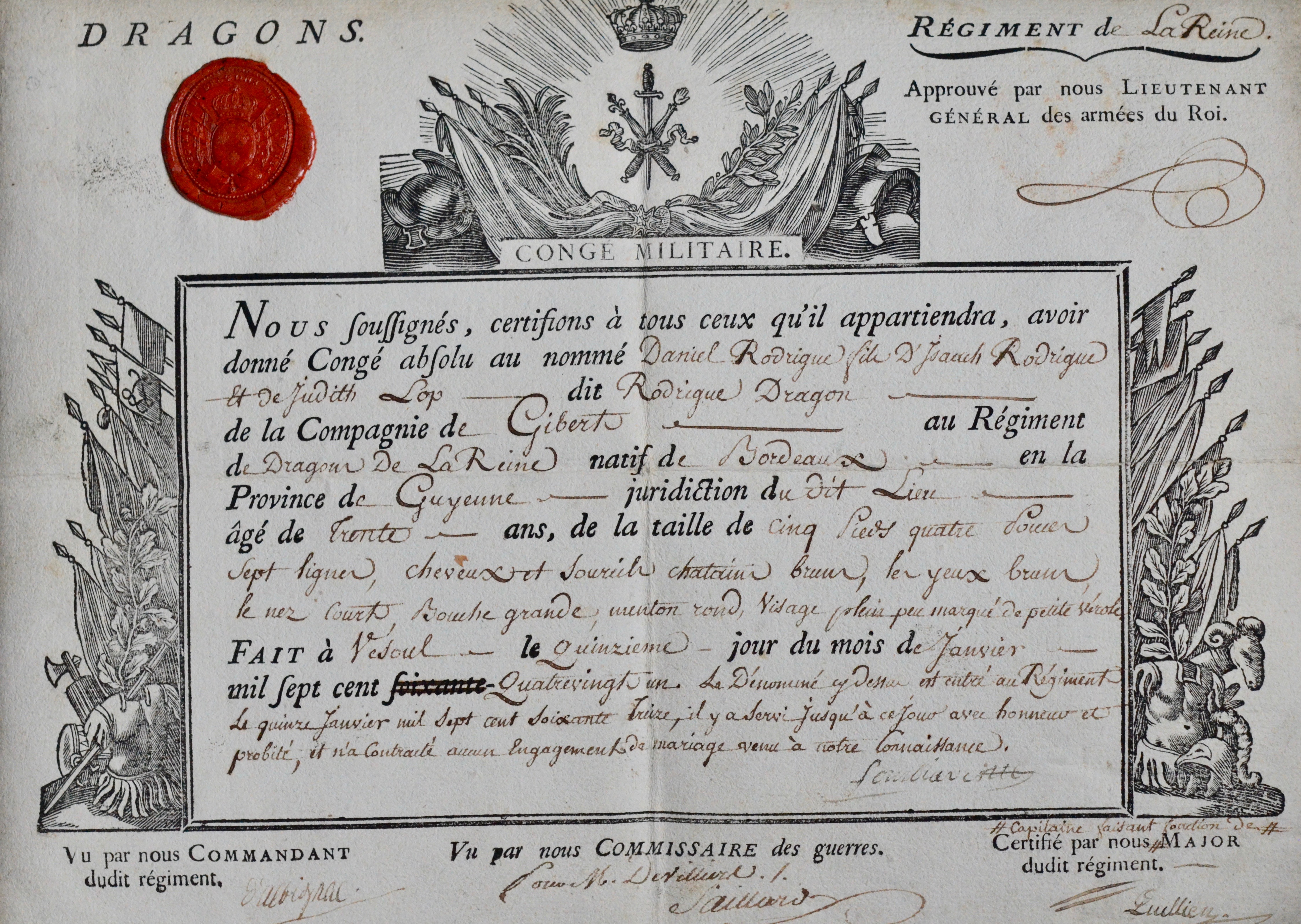 "Nous soussignés, certifions à tous ceux qu'il appartiendra, avoir donné congé absolu au nommé Daniel Rodrigue fils d'Isaach Rodrigue et de Judith Lop dit Rodrigue Dragon de la Compagnie de Gilbert au Régiment de Dragons de La Reine natif de Bordeaux en la Province de Guyenne [...]". Suit la description physique dudit Daniel Rodrigue "[...] cheveux et sourcils châtains brun, les yeux bruns, le nez court, bouche grande, menton rond, visage plein peu marqué de petite vérole [...]". Suivent quatre signatures, dont celle du commandant du régiment, d'Albignac.