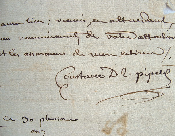 Constance de Théis Salm-Dyck (princesse de) (Nantes, 1767/1845)Constance Pipelet [la future princesse de Salm-Dyck était alors mariée à Pipelet de Leury] dément être l'auteur de vers sur La Mort d'un Chat. «Je n'en ai jamais fait qui eussent ce titre, sans doute, vous vous trompés, ou quelqu'un se sera amusé à contrefaire ma signature». Elle annonce ceux lus au Lycée républicain. «Je me ferai un vrai plaisir d'en joindre ici quelques tirades», même si la Décade philosophique vient de les publier en partie. Elle propose d'en différer de deux jours la publication. «Cette pièce de vers va paraître imprimée séparément ; vous pourriés à la fois l'annoncer et en rendre compte dans votre journal, ce qui me serait doublement agréable : dans tous les cas, je vous adresserai un exemplaire [...]». [Elle connut une grande popularité sous le Directoire ; surnommée "la Muse de la Raison" ou "le Boileau des femmes" par Marie-Joseph Chénier, elle fut aussi la première femme admise au Lycée, où elle lut plusieurs éloges en prose, notamment ceux de Sedaine (1797)].