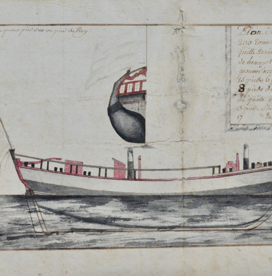 - Dessin du navire en question, à l'encre et aquarelle, légendé dans un cartouche : « Plan d'un navire d'environ 200 tonneaux ayant 62 pieds de quille, trainant sur terre 22 pieds de beaux, 14 pieds 6 pouces de bordée […] ». Plan de profil et de face du bâtiment.