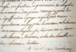 Lettre de l'évêque d'Orléans, qui est aussi Ministre de la feuille des bénéfices et s'occupe, à ce titre, des attributions des bénéfices ecclésiastiques, relative au droit d'économat du chapitre de la Sainte-Chapelle de Vincennes, "qui conteste au Roy son droit d'économat sur la trésorerie vacante de ladite Eglise". "Comme la contestation qu'élève aujourd'huy M. de La Roche St André et le chapitre de Vincennes est contre toutes les règles et du bon ordre et de la justice, vous exécuterez ce qui vous est expressément ordonné par l'Edit de 1691 qui règle vos fonctions et poursuivrez le Chapitre de Vincennes [...]".