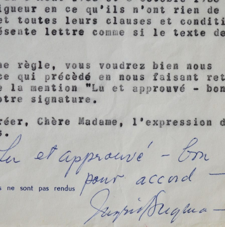 Ingrid Bergman (Stockholm, Suède, 1915/1982)Lettre signée d'Ingrid Bergman, avec ajout autographe "Lu et approuvé - Bon pour accord".