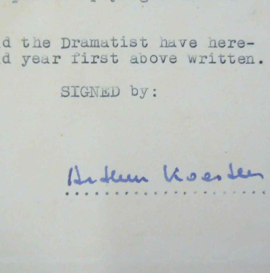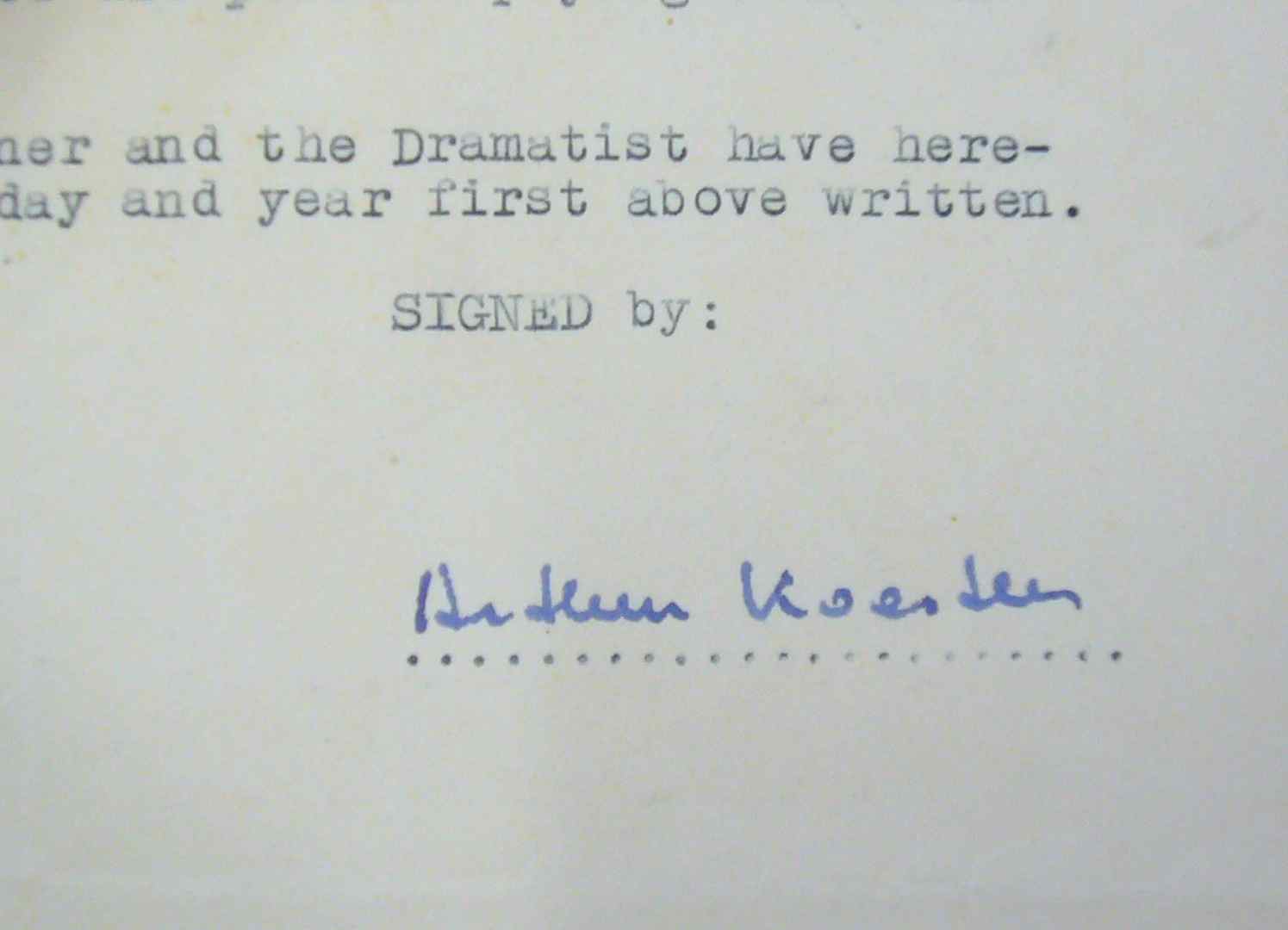 Contrat pour l'adaptation théâtrale du roman d'Arthur Koestler "Arrival and departure", par le comédien et metteur en scène belge Victor Francen. 11 articles détaillent les conditions d'adaptation. Le document est signé par Arthur Koestler. [Il semble que ce projet ne vit jamais le jour].