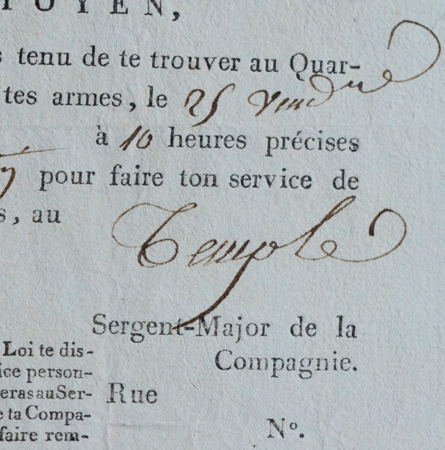 Convocation adressée à un militaire, nommé Chambaud, à venir assurer sa garde à la Prison du Temple, le 25 Vendémiaire an II à 10h, c’est-à-dire le 16 octobre 1793, le jour même de l’exécution de la Reine Marie-Antoinette.