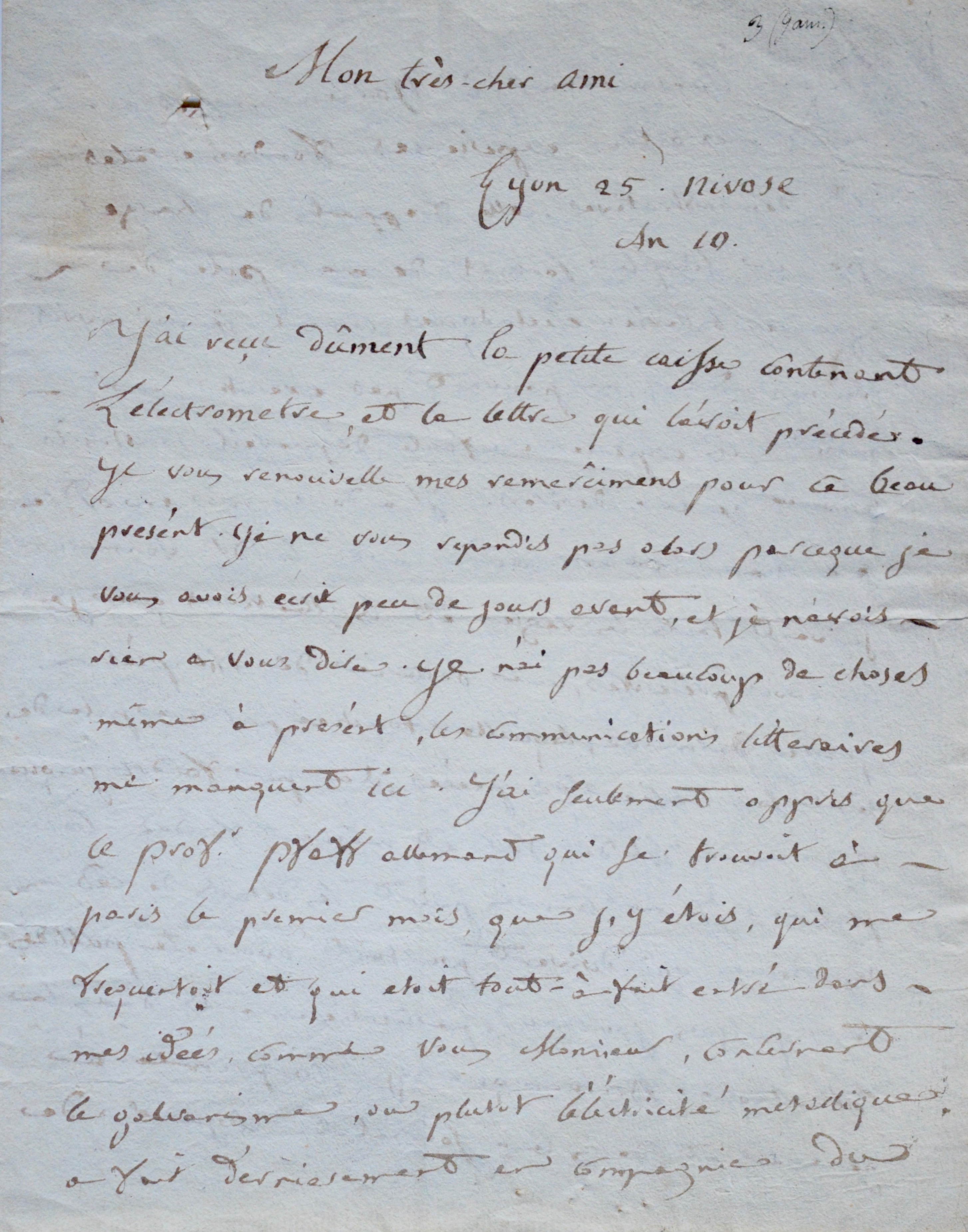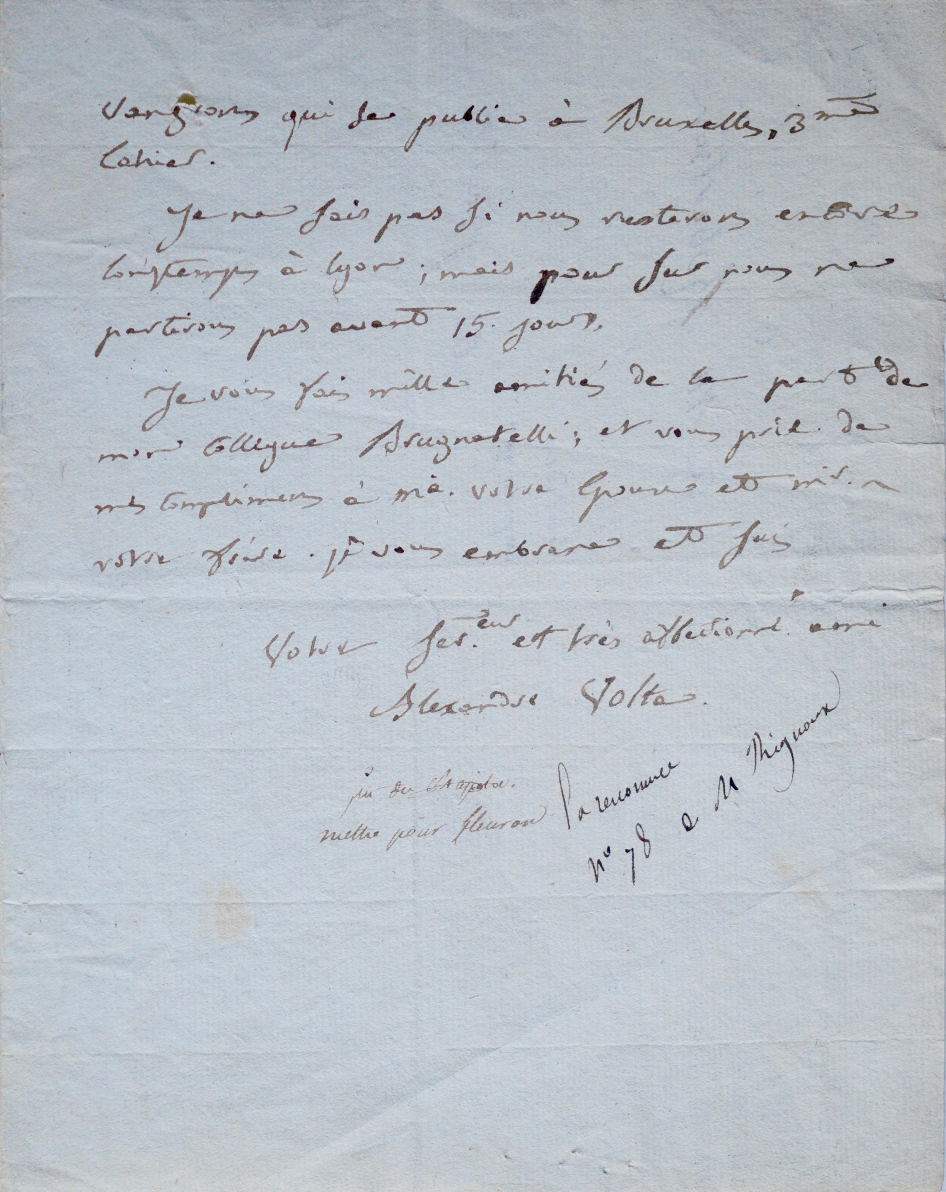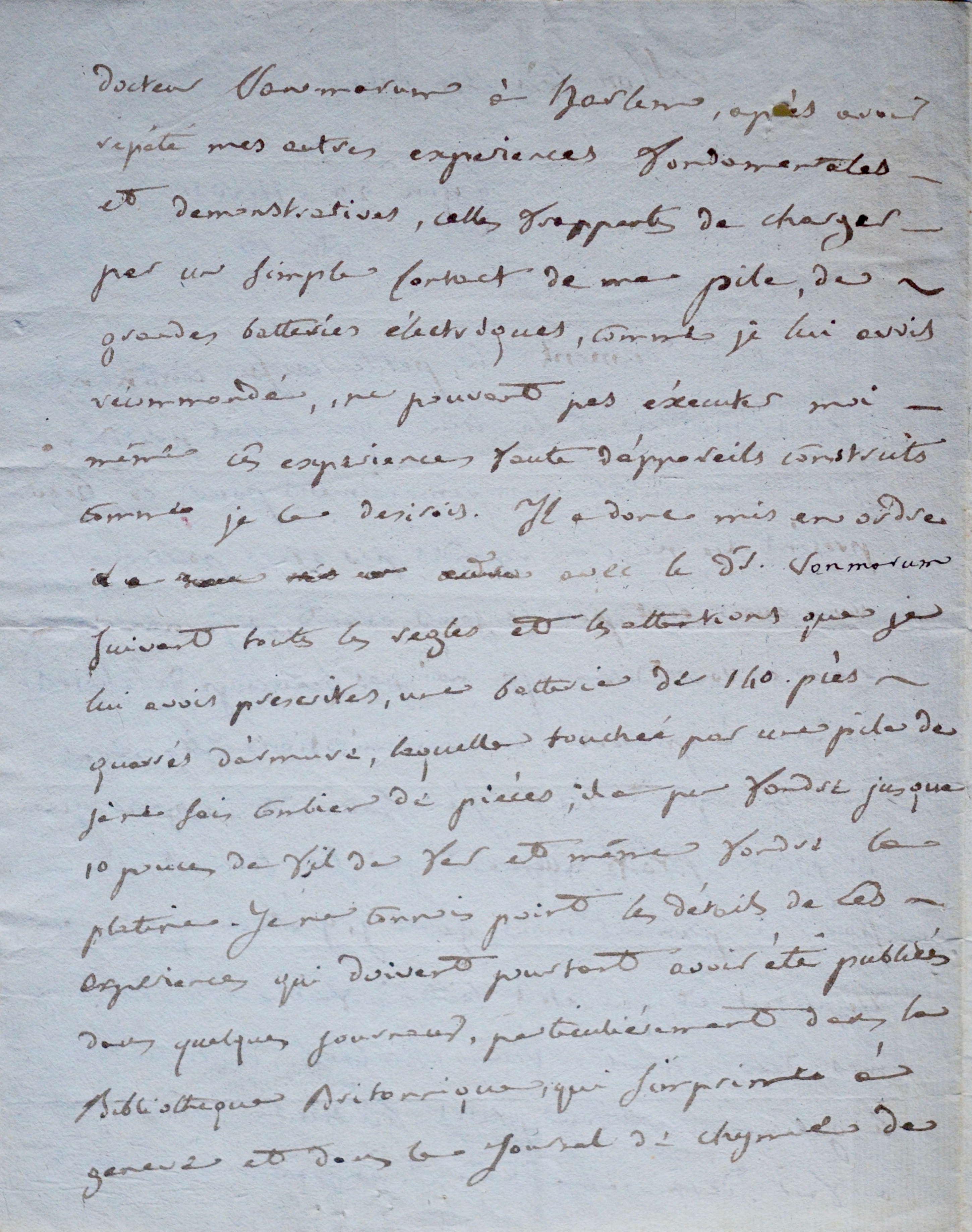 "[...] J'ay reçu dûment la petite caisse contenant l'électromètre et la lettre qui l'avoit précédé [...]. [Pfaff], qui se trouvoit à paris le premier mois que j'y étais, qui me fréquentoit et qui étoit tout à fait entré dans mes idées, comme vous Monsieur, concernant le galvanisme, ou plutôt l'électricité métallique, a fait dernièrement... à harlem, après avoir répété mes autres expériences fondamentales et démonstratives, celles frappant de charger par un simple contact de ma pile, de grandes batteries électriques, comme je lui avais recommandé, ne pouvant pas exécuter moi-même les expériences, faute d'appareil construits comme je le désirois [...]". Il lui transmet "mille amitiés" de son collègue, le chimiste italien Luigi Valentino Brugnatelli (1761-1818).