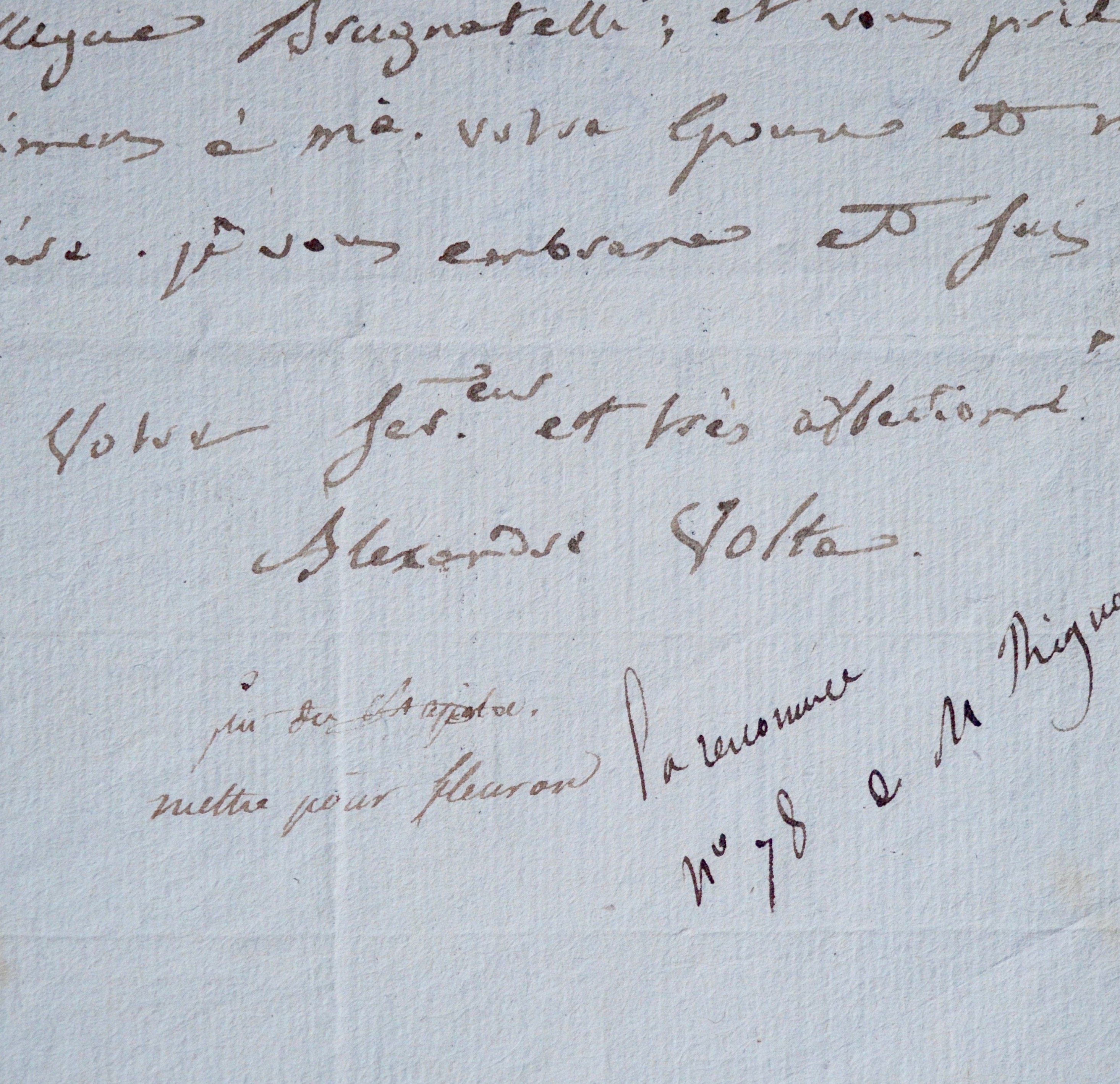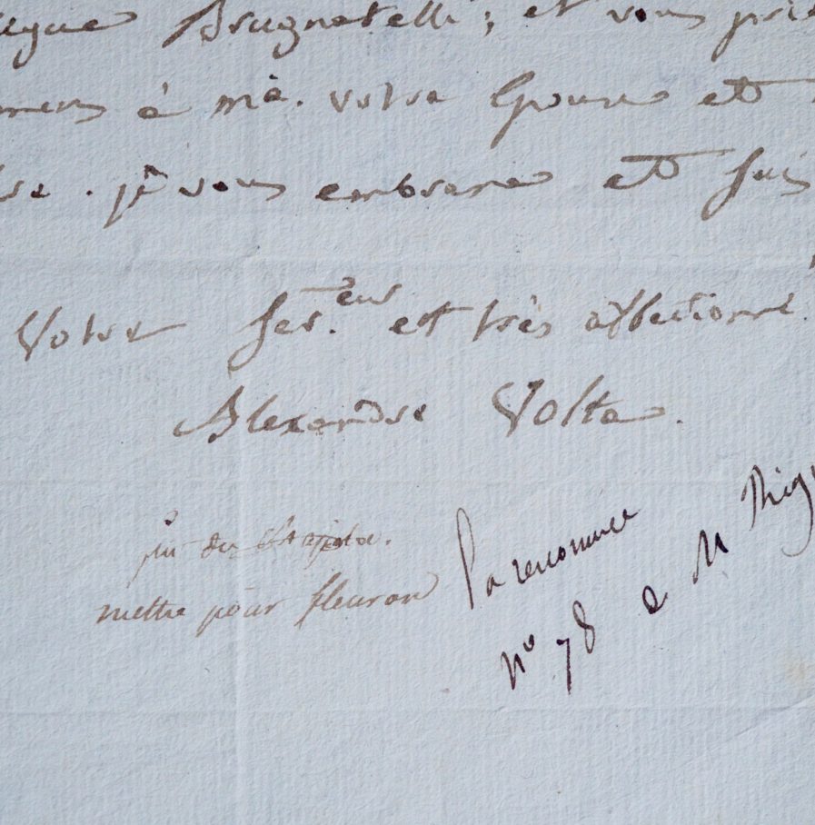 Volta, qui vient de recevoir la Légion d'Honneur, remercie Robertson de l'envoi d'un "électromètre". Il l'informe des expériences réalisées par ses confrères Christoph Heinrich Pfaff (1773-1852) en collaboration avec Martin Van Marum (1750-1837) :