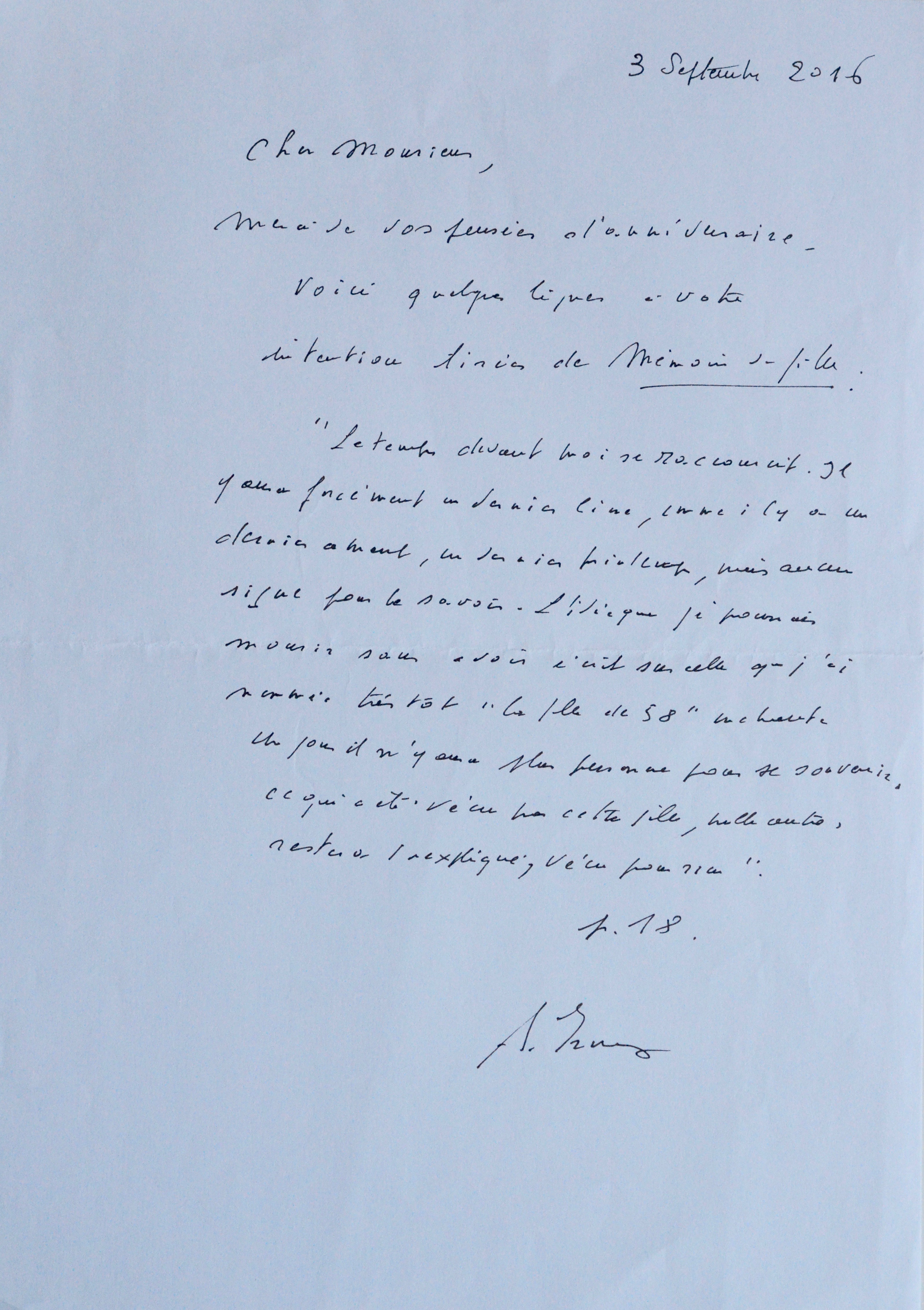 "Cher Monsieur, Merci de vos pensées d'anniversaire. Voici quelques lignes à votre intention tirées de Mémoire de fille :