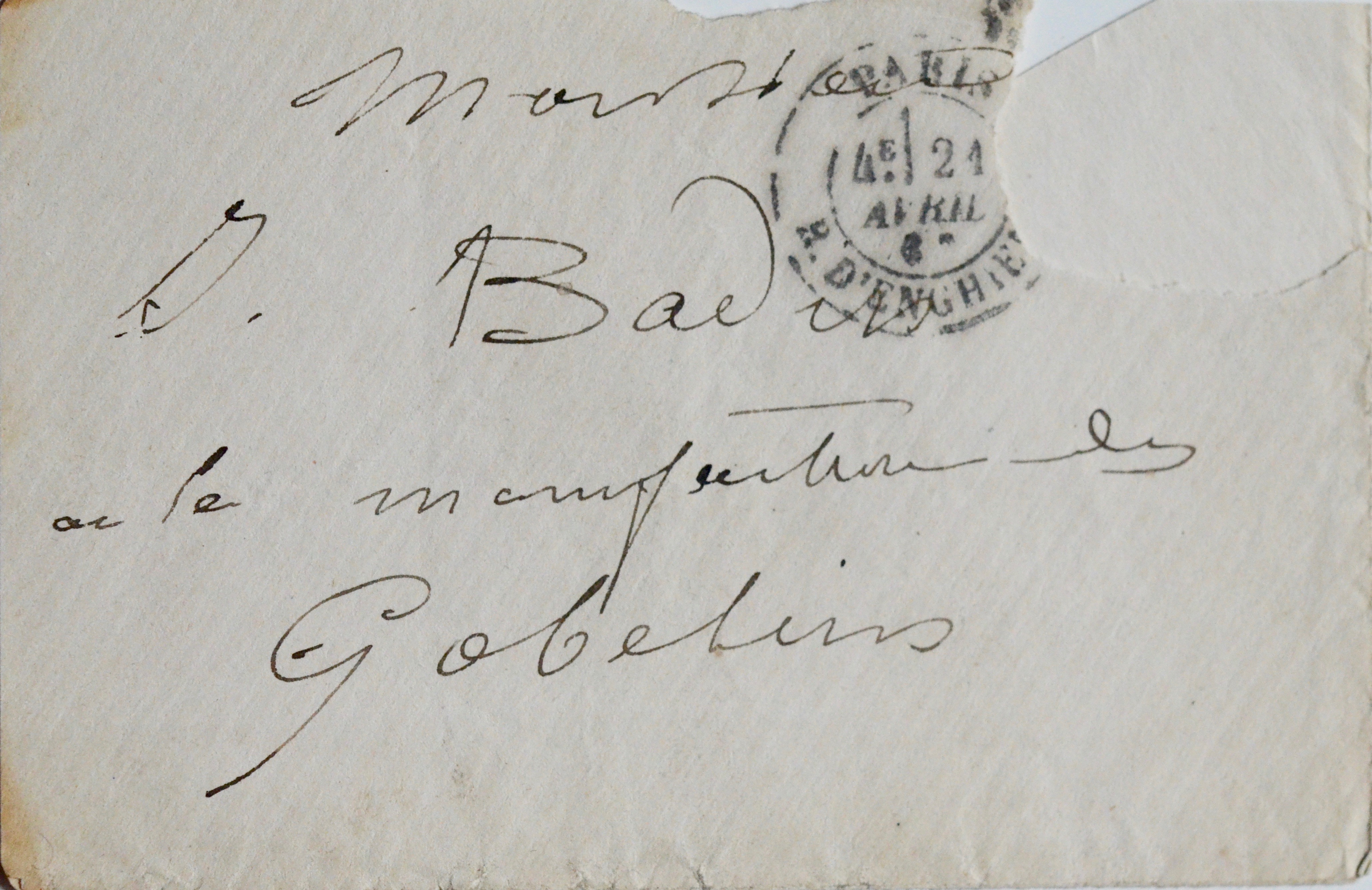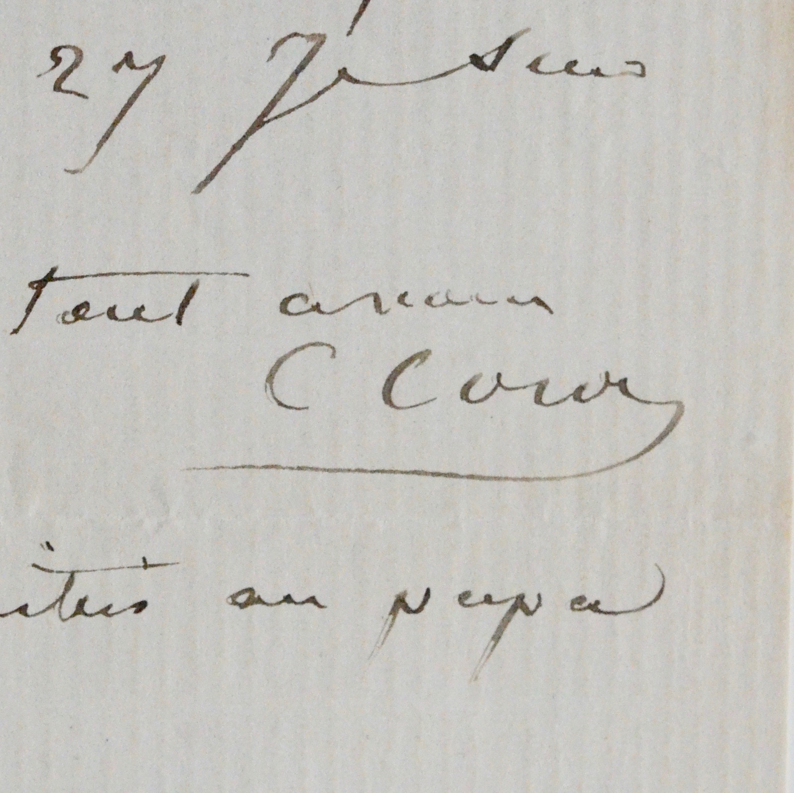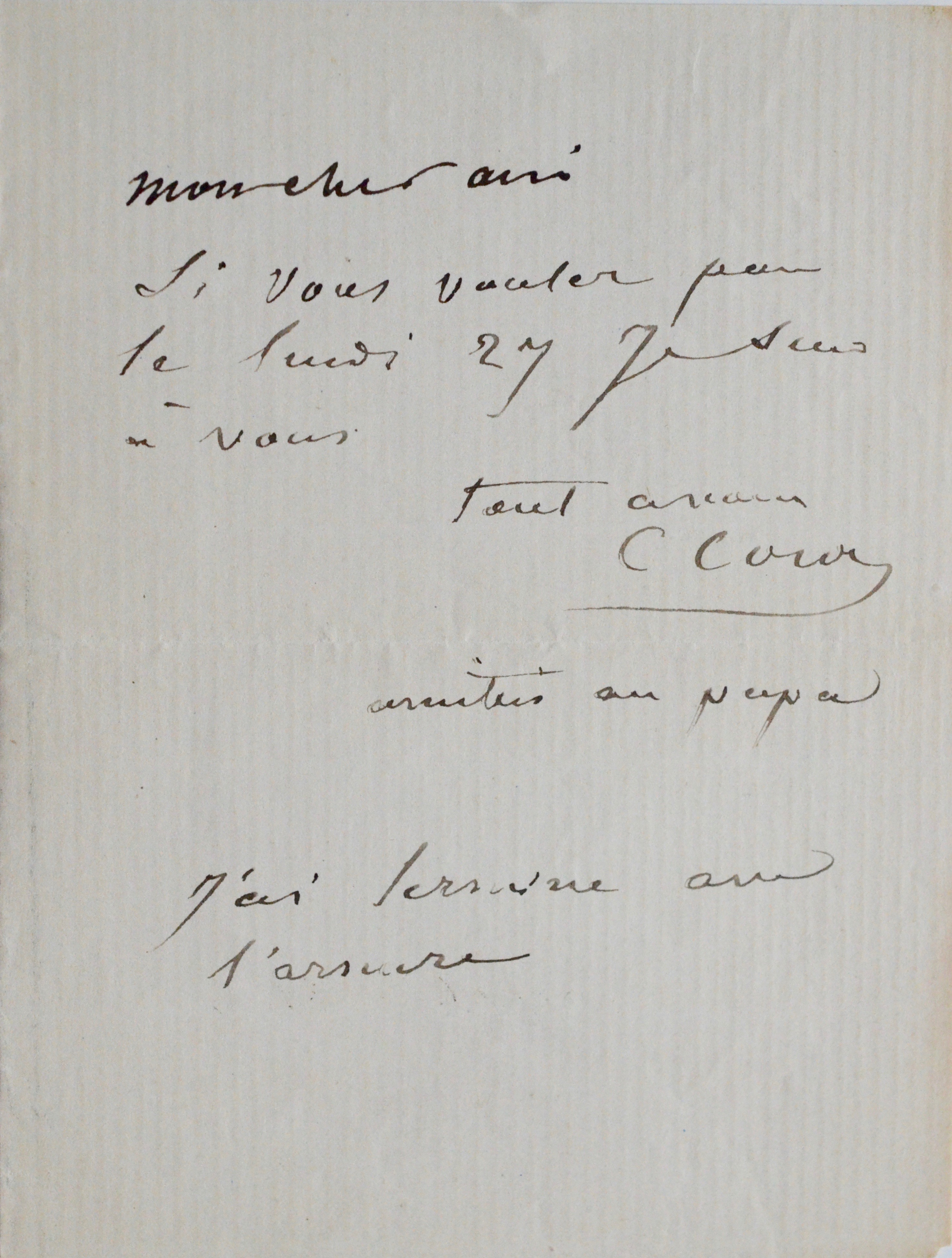"Mon cher ami. Si vous voulez pour le lundi 27 je suis à vous. Tout à vous. C. Corot. Amitiés au papa [...]". Le père de Jules Badin, Pierre-Adolphe Badin (1805-1877), fut lui même administrateur de la Manufacture de Beauvais et des Gobelins.