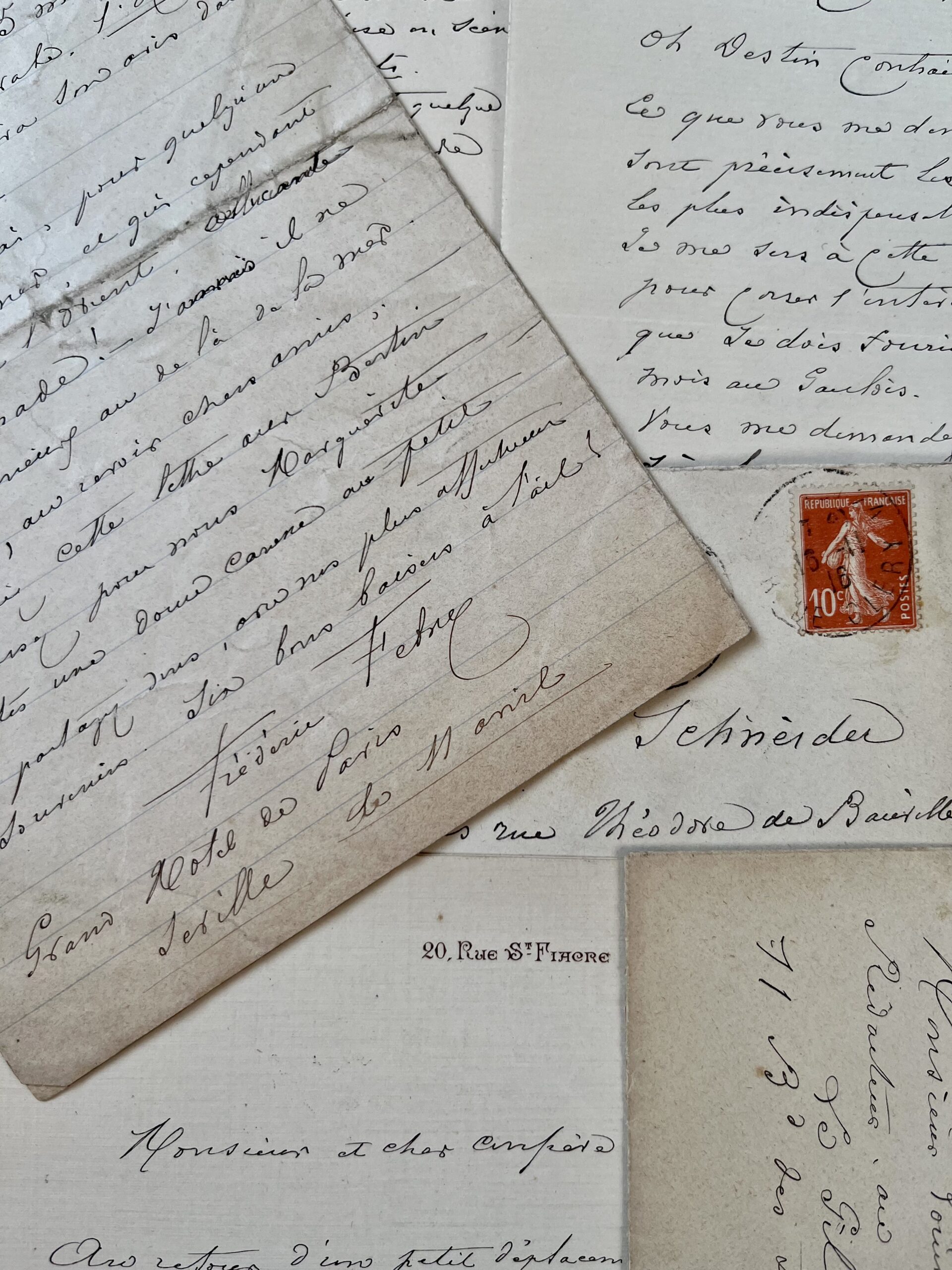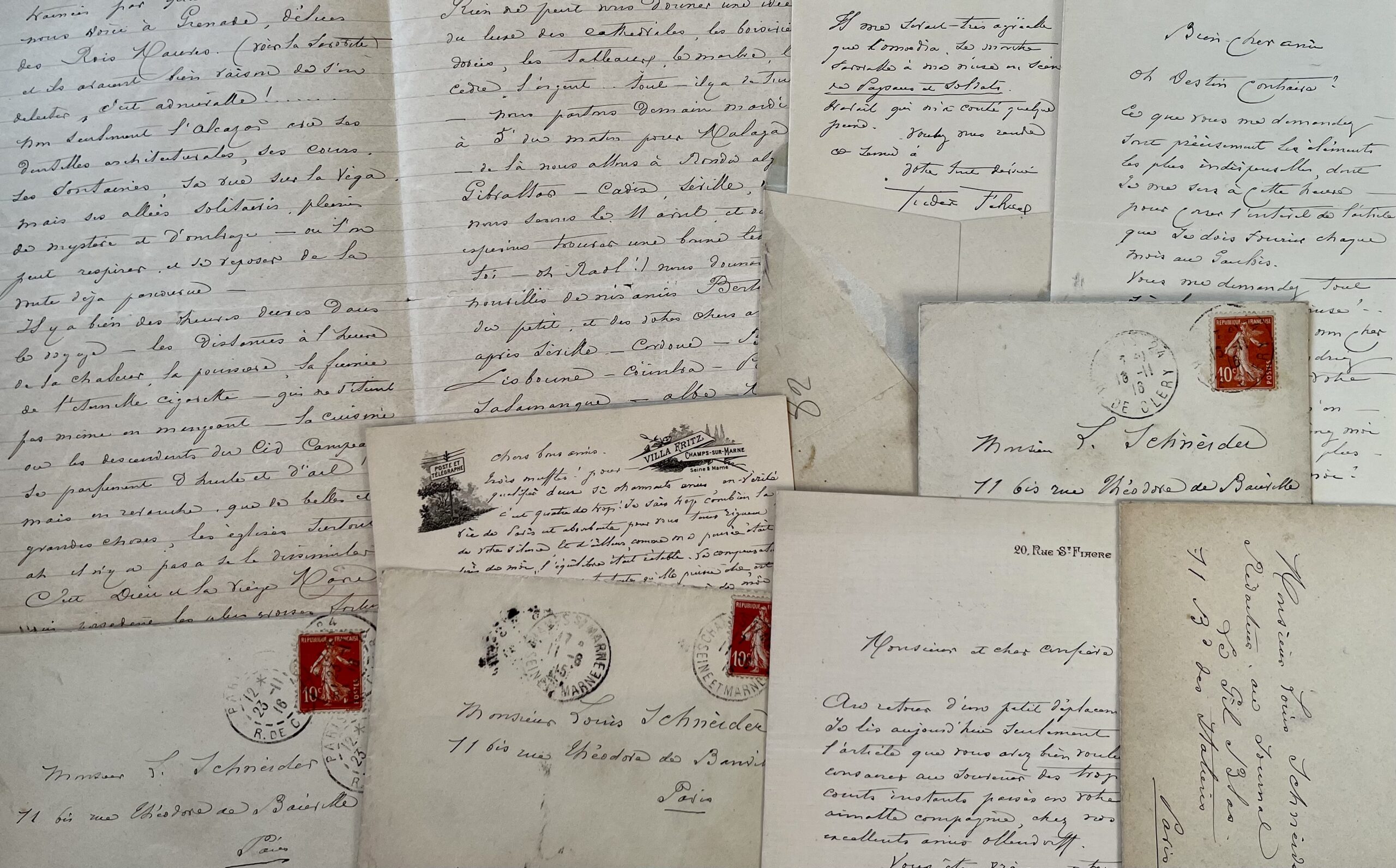 Frédéric Febvre (Paris, 1835/1916)Ensemble de cinq courriers adressés par l'ancien sociétaire de la Comédie-Française, Frédéric Febvre à son ami Louis Schneider. Il y raconte notamment un long séjour en Espagne, de Barcelone à Valence, de Saragosse à Alicante, de Tarragone à l'Alcazar. Il relate la chaleur, l'architecture, la cuisine, le luxe des cathédrales, puis Séville, Cordoue, Madrid, et son retour à la villa Fritz à Champs-sur-Marne. Il a lu un article relatif à leurs souvenirs communs avec Ollendorff et en remercie son correspondant, puis demande un article en sa faveur. "Il me serait très agréable que Comoedia se montre favorable à ma mise en scène de Paysans et soldats. Travail qui m'a couté quelque peine [...]".