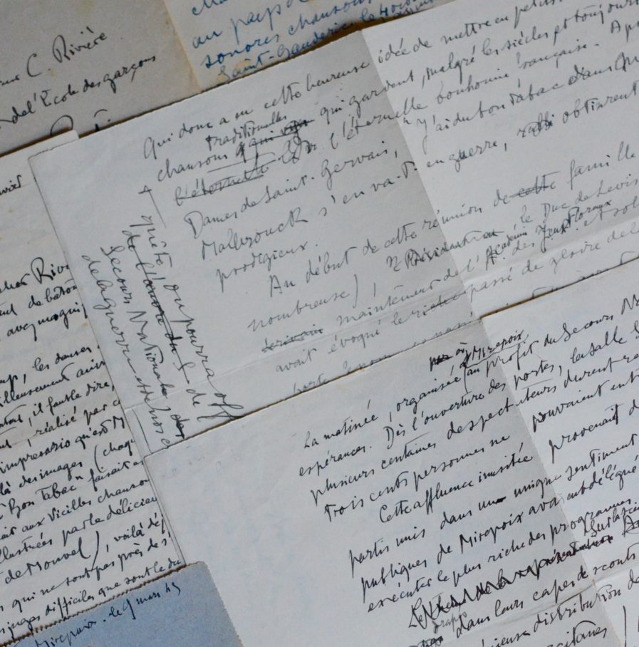 Raymond Escholier remercie l'abbé Casy Rivière d'avoir chanté "d'une si belle voix, au pays de Cantegril, les sonores chansons de Bethmale [petite commune de l'Ariège]." [Le roman Cantegril, de Raymond Escalier, fut publié en 1921 aux éditions Ferenczi et reçut la même année le prix Femina]. Plus tard, en 1940, il félicite son ami d'avoir admirablement animé une fête préparée pour le "relèvement national" devant le duc et la duchesse de Lévis-Mirepoix. Ces souvenirs sont impérissables. La lettre est accompagnée d'un brouillon manuscrit contenant un texte relatif à cette même occasion, organisée au profit du Secours National. Il loue le très grand succès rencontré auprès de la population et le niveau des fonds collectés. Les sketches, la danse, les chansons ont tenu le public en haleine : "Molière, Victor Hugo [il fut conservateur de la Maison de Victor Hugo] furent applaudis, ainsi que les poètes du terroir [...]".