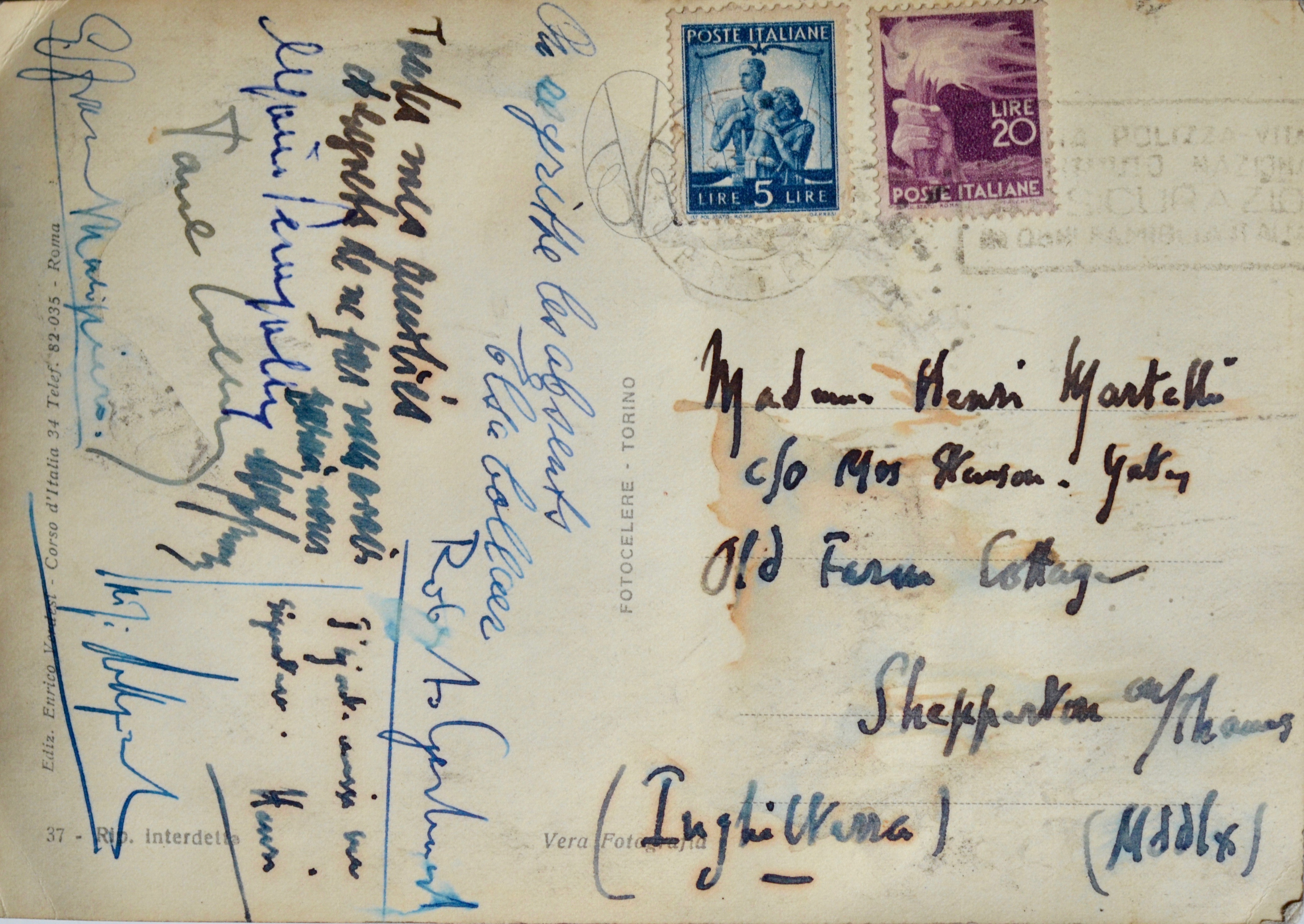 -Carte postale adressée à Madame Martelli, signée par sept compositeurs dont : Luigi Dallapiccola, Gian Francesco Malipiero, Elsa Collaer, Roberto Gerhard, Henri Martelli, Paul Collin.