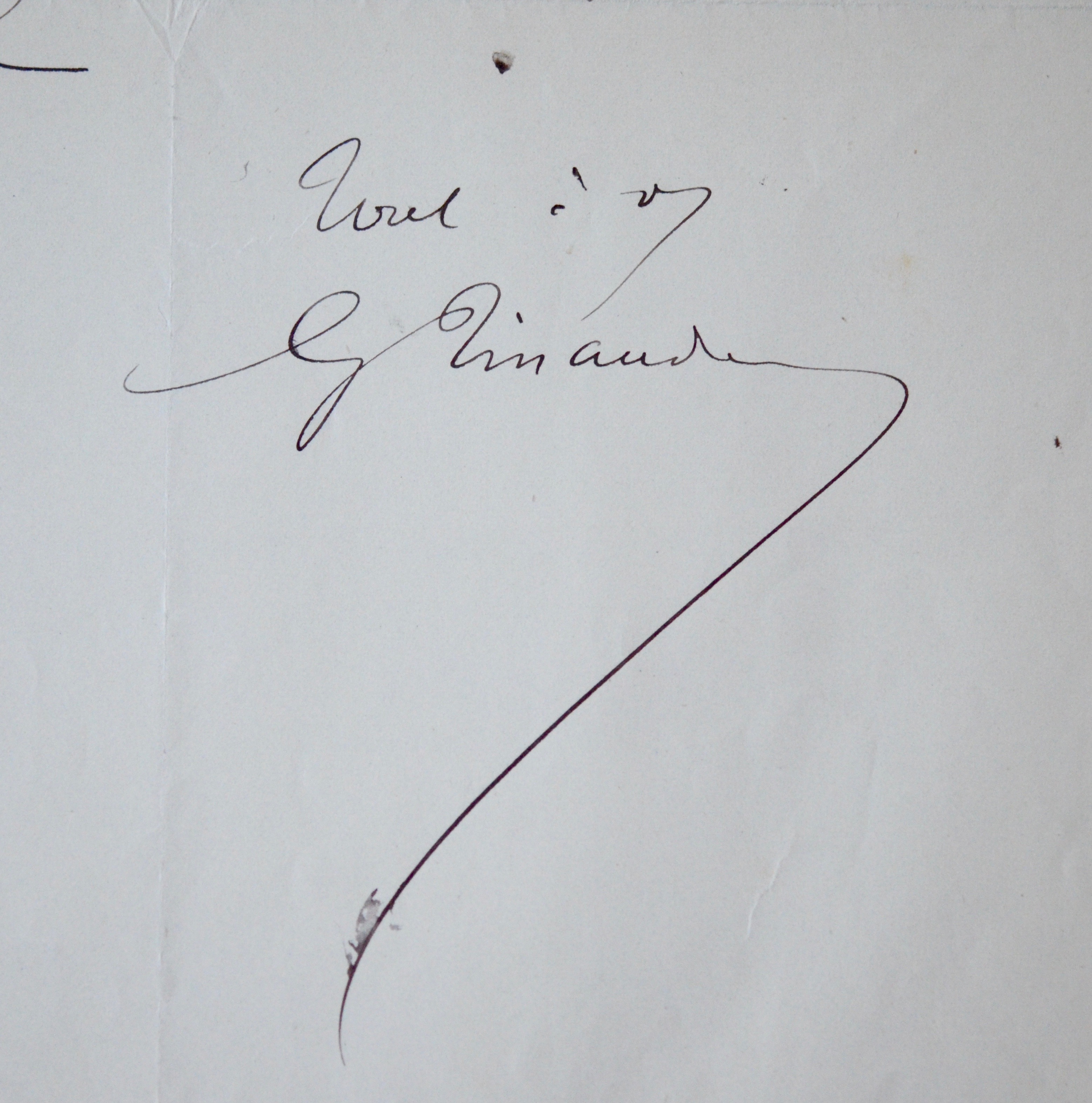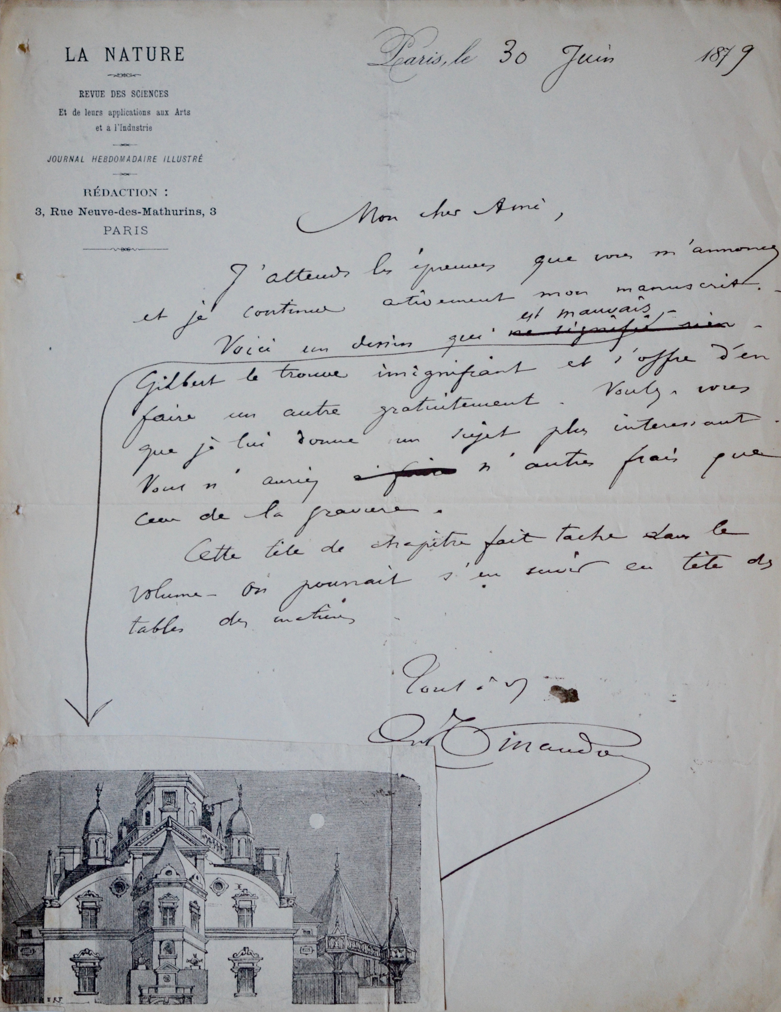 "J'attends des épreuves que vous m'annoncez et je continue activement mon manuscrit. Voici le dessin qui est mauvais. Gilbert le trouve insignifiant et s'offre d'en faire un autre gratuitement [...] cette tête de chapitre fait tache dans le volume. On pourrait s'en servir en tête des tables des matières [...]". (30 juin 1879).