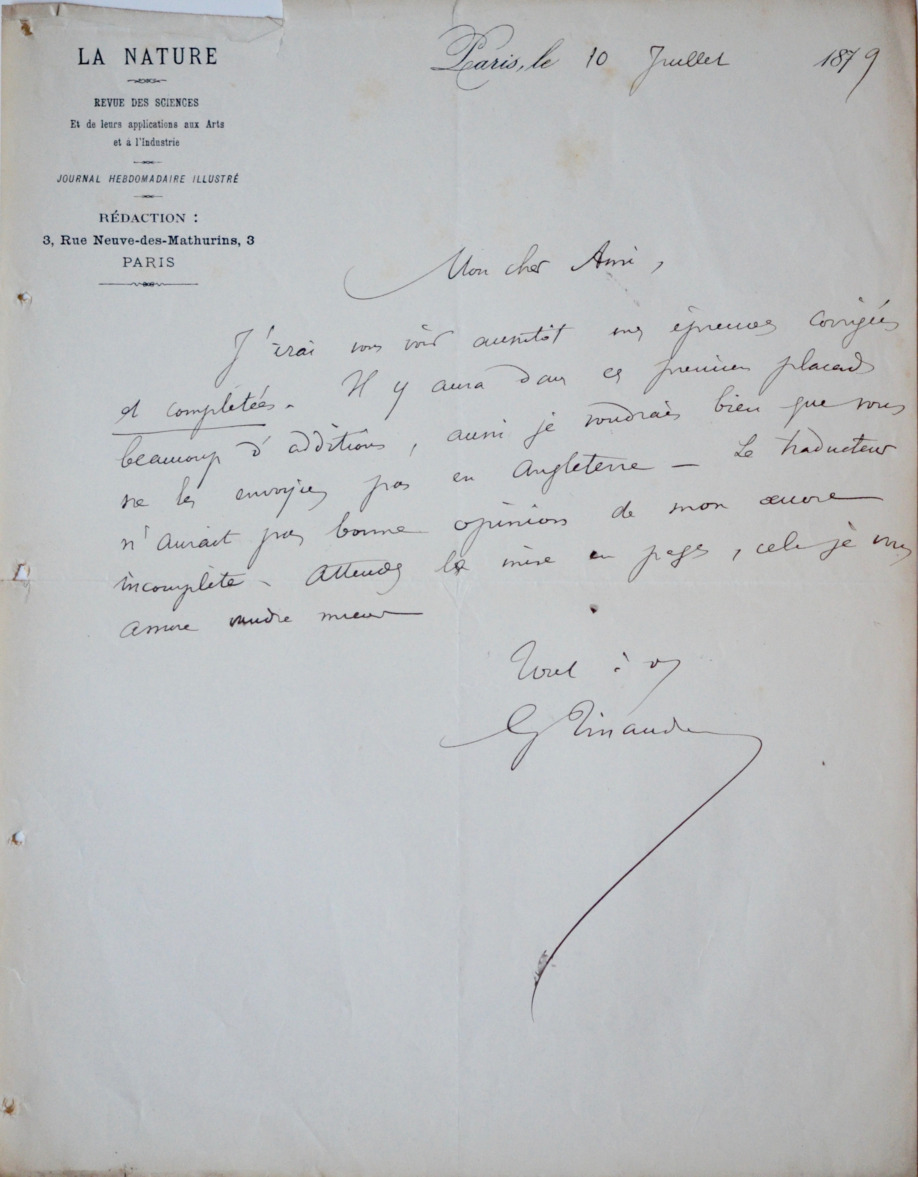 "[...] J'irai vous voir aussitôt mes épreuves corrigées et complétées. Il y aura dans les premiers placards beaucoup d'addition [...]". (10 juillet 1879).