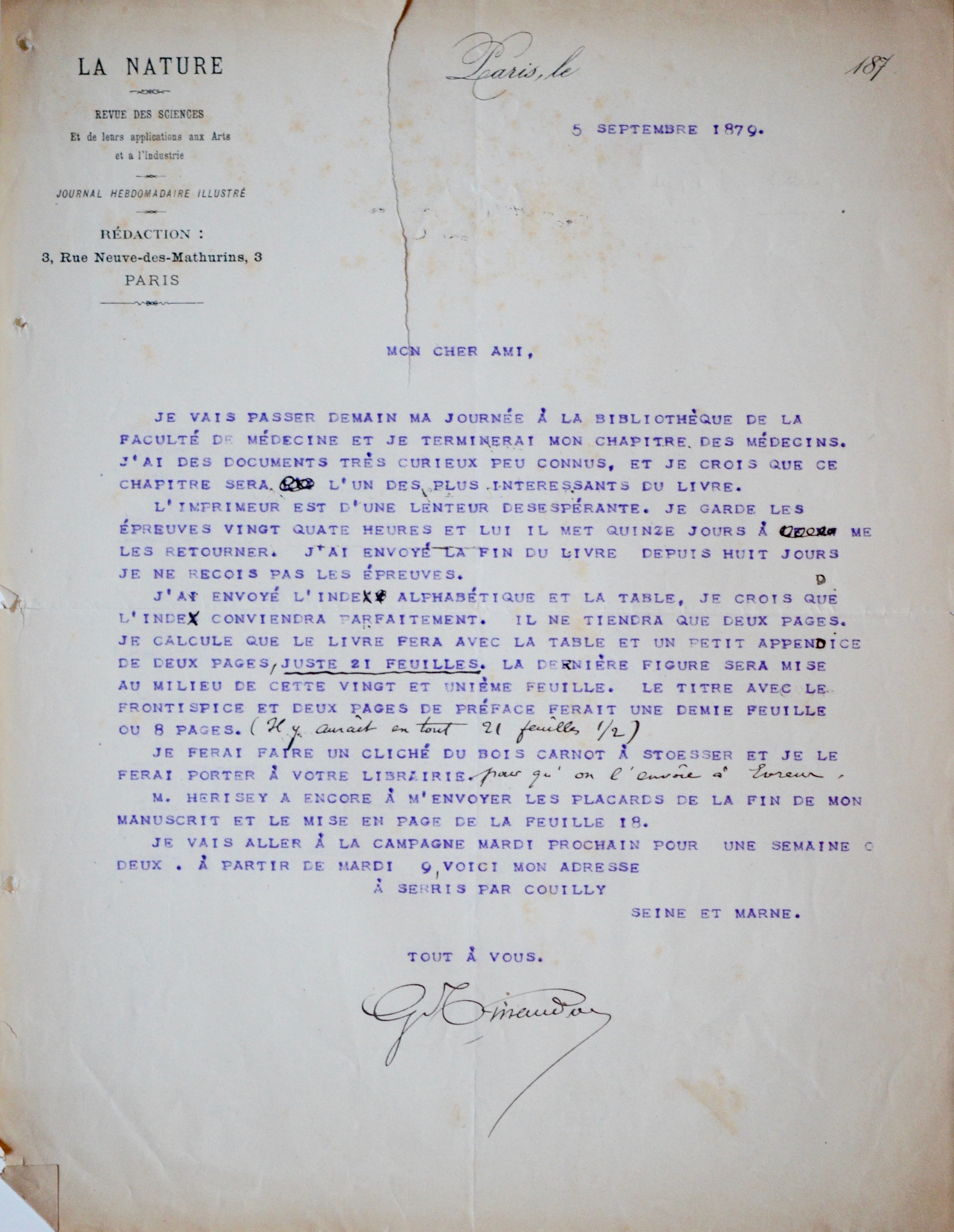 "[...] Je vais passer demain ma journée à la bibliothèque de la faculté de médecine et je terminerai mon chapitre des médecins. J'ai des documents très curieux peu connus, et je crois que ce chapitre sera l'un des plus intéressants du livre. L'imprimeur est d'une lenteur désespérante. Je garde les épreuves vingt quatre heures et lui il met quinze jours à me les retourner [...]. Je calcule que le livre fera avec la table et un petit appendice de deux pages, juste 21 feuilles [...]. (5 septembre 1879. Lettre dactylographiée avec ajouts et corrections autographes. C'était les prémices de la machine à écrire).