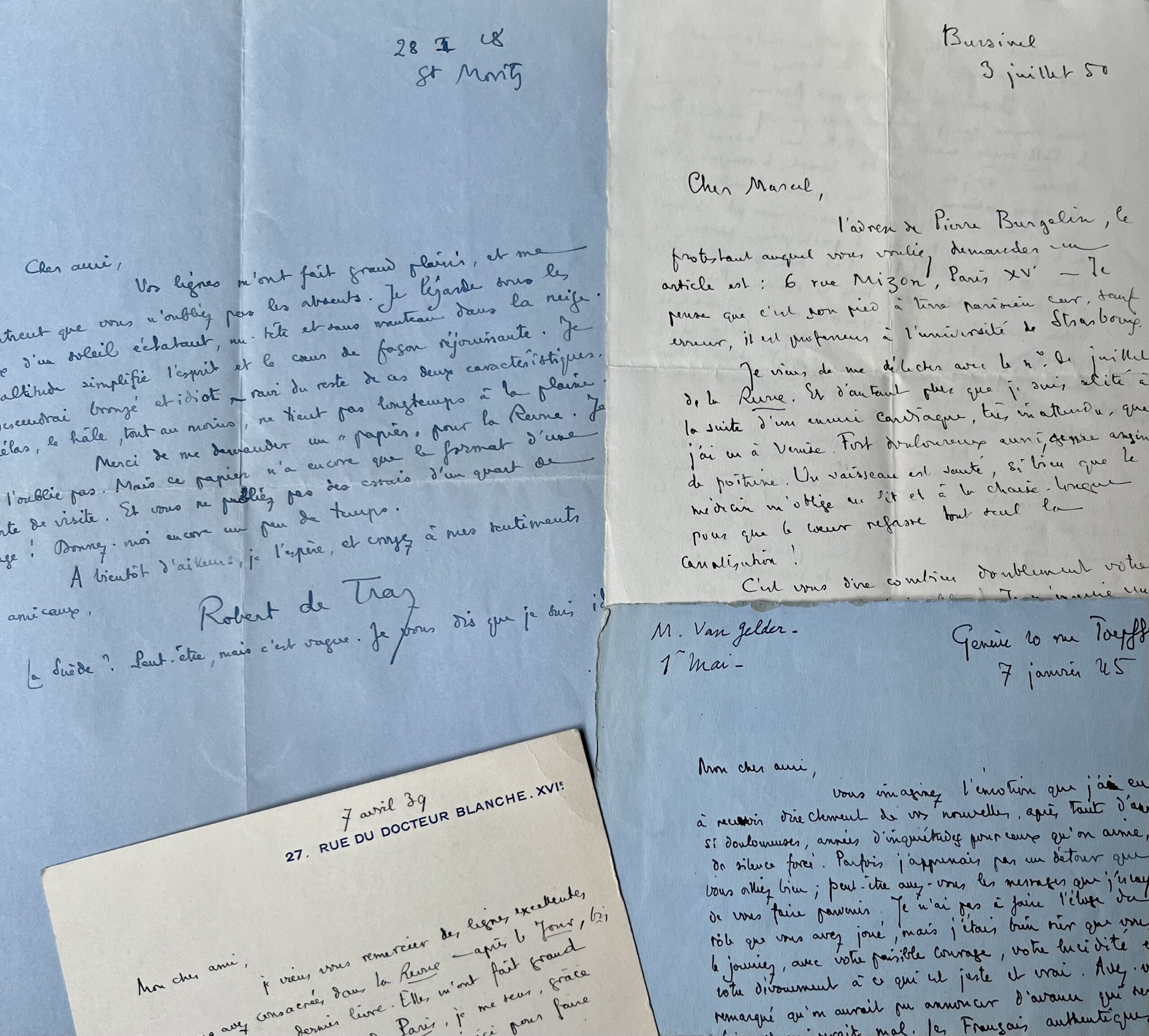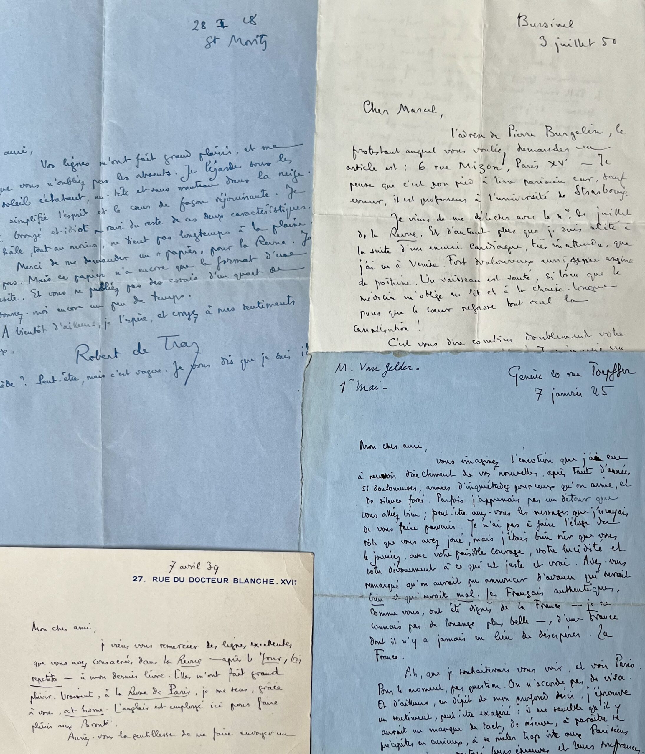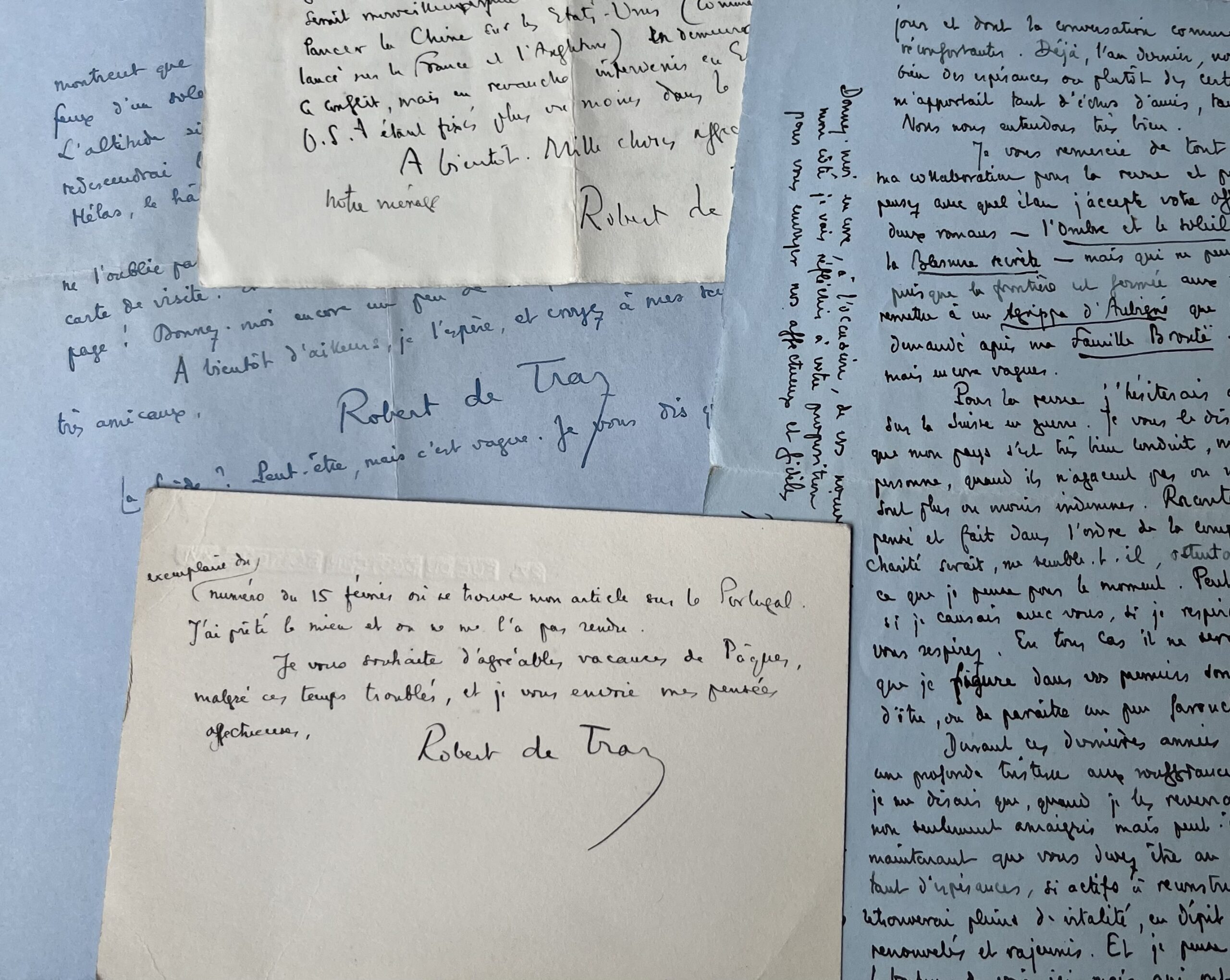 Robert de Traz (Paris , 1884 /1951)Belle correspondance amicale et littéraire du romancier suisse Robert de Traz, en particulier sur les années de guerre en Suisse.