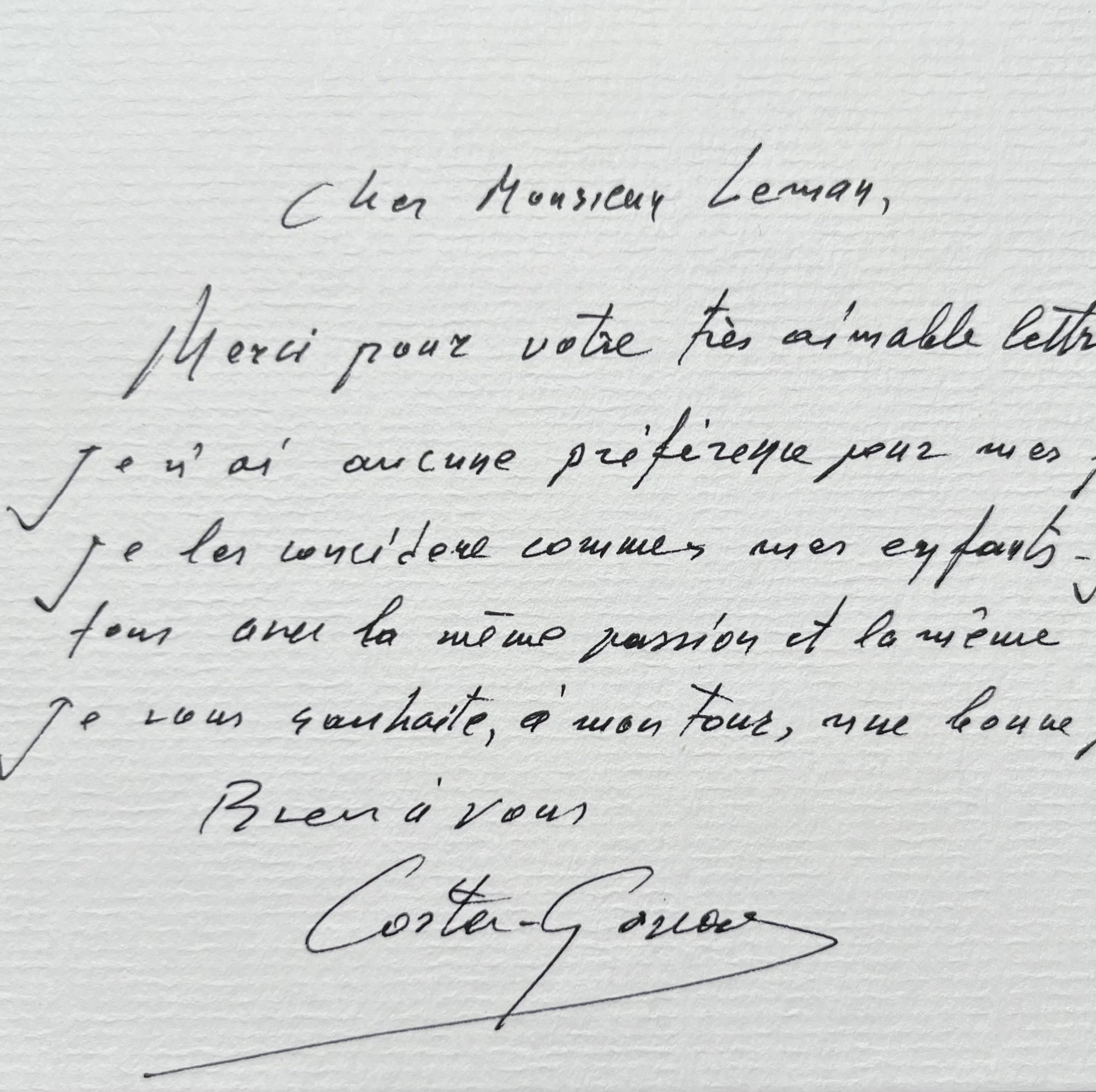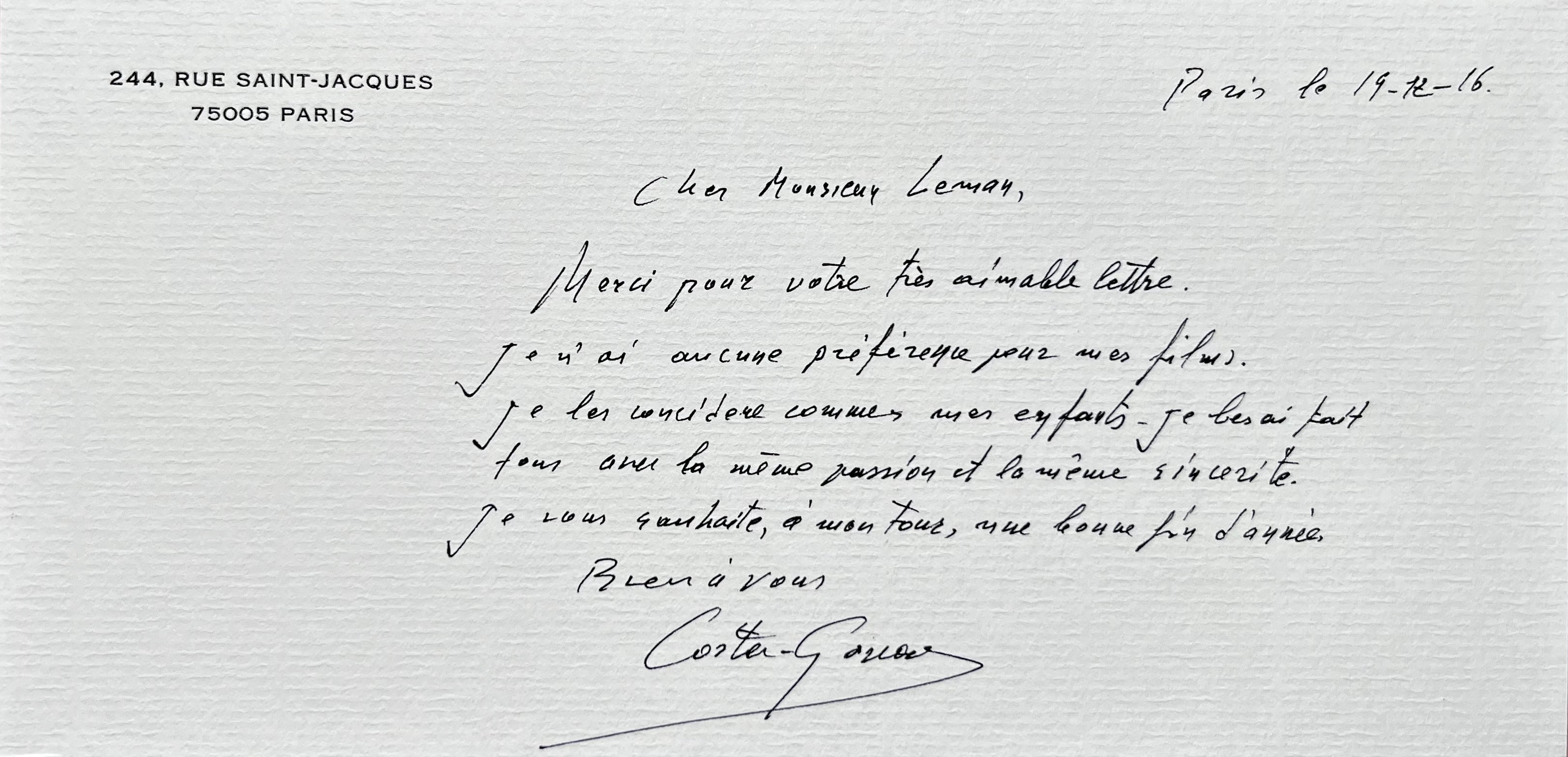 "Merci pour votre très aimable lettre. Je n'ai aucune préférence pour mes films. Je les considère comme mes enfants. Je les ai fait tous avec la même passion et la même sincérité [...]".
