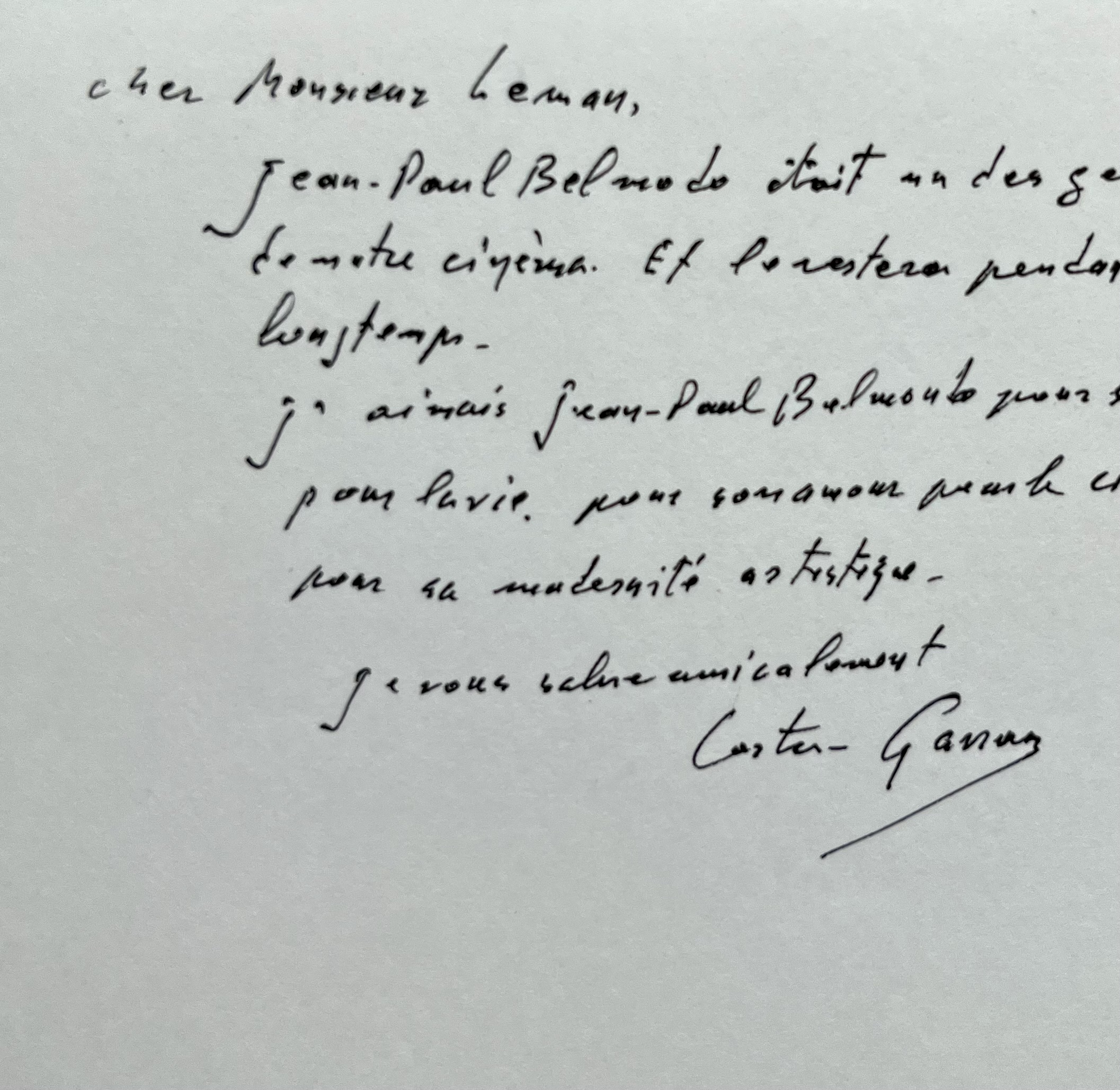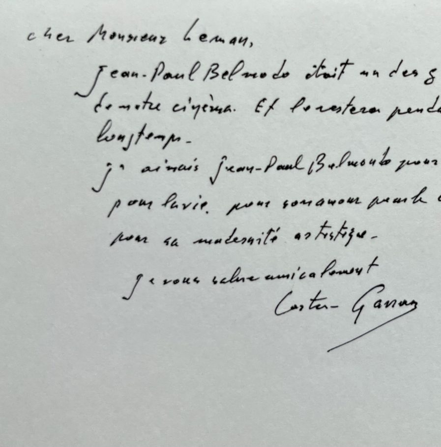 "Jean-Paul Belmondo était un des géants de notre cinéma et le restera pendant bien longtemps. J'aimais Jean-Paul Belmondo pour sa passion pour la vie, pour son amour pour le cinéma, pour sa modernité artistique. Je vous salue amicalement. Costa-Gavras".