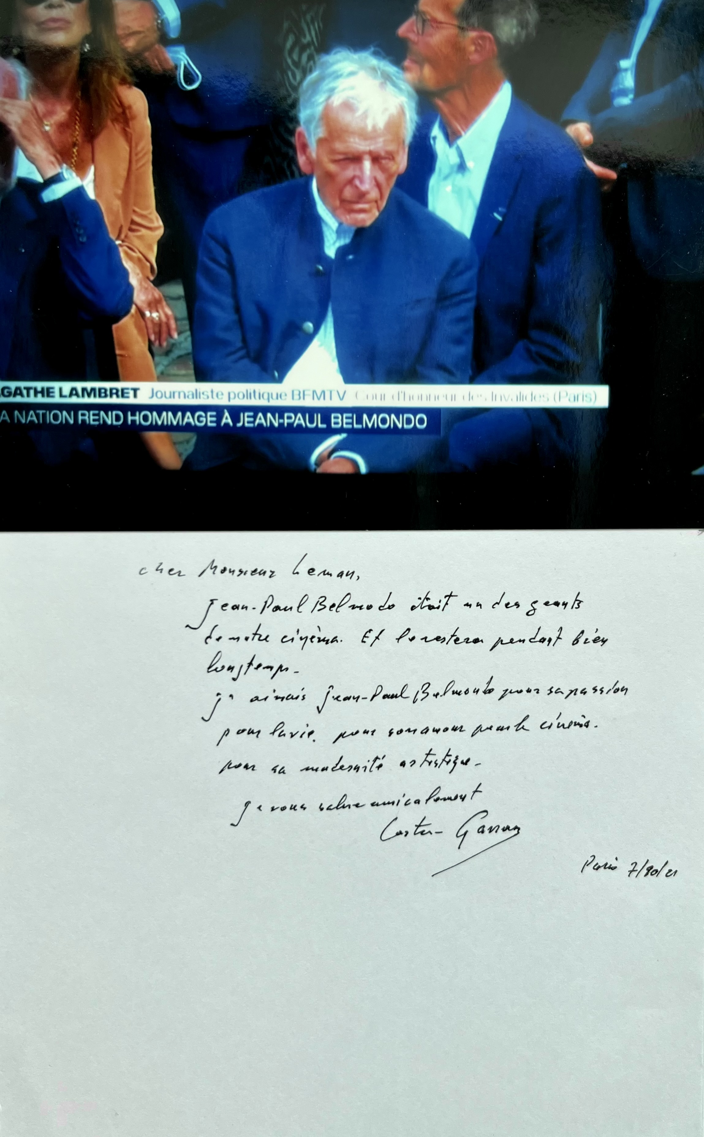 Costa-Gavras commente la mort de Jean-Paul Belmondo, sous une photographie originale, montée sur bristol, le représentant aux obsèques de l'acteur :
