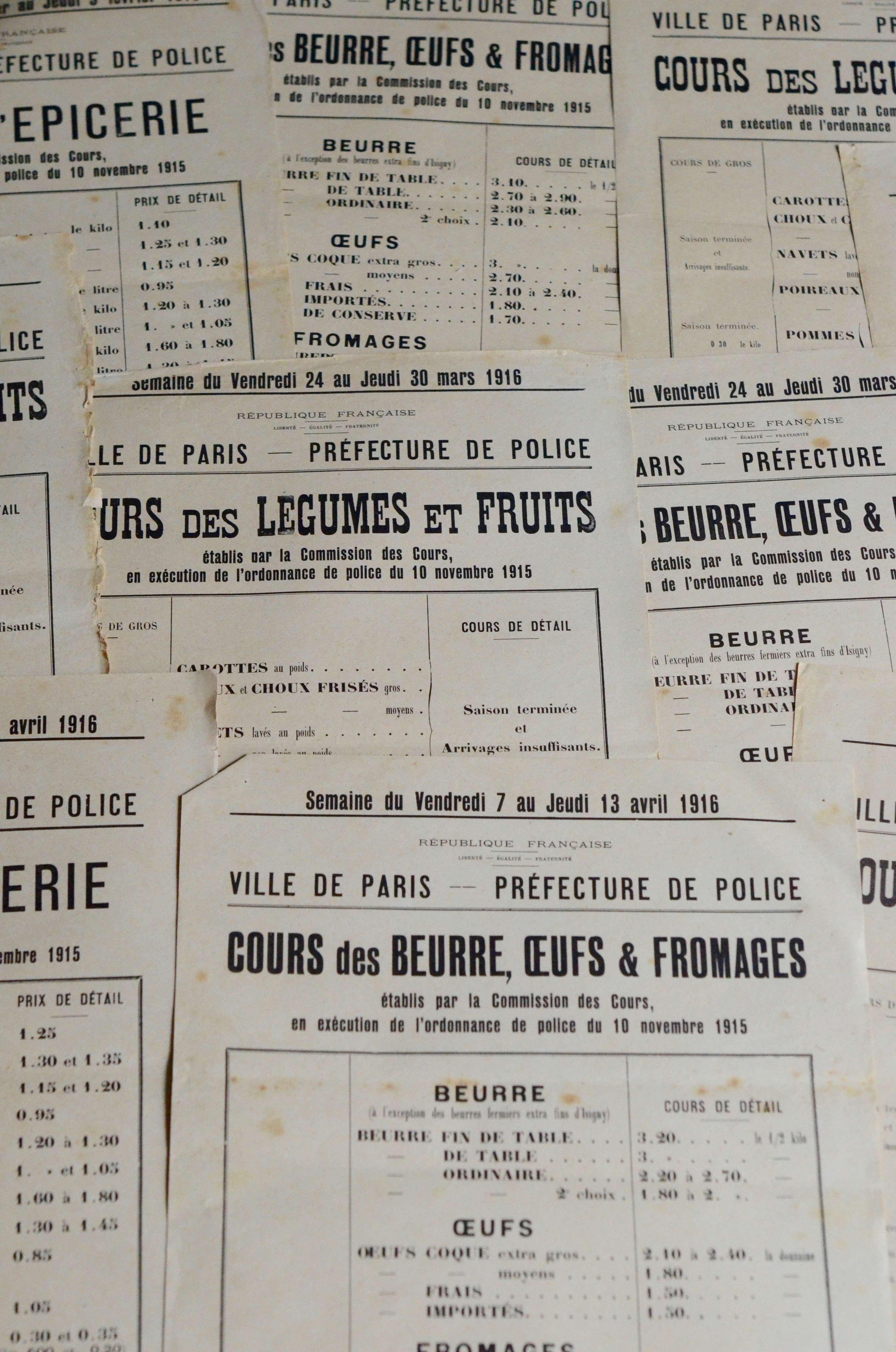 Série de 10 petites affiches donnant les cours des denrées vendues sur la place de Paris (épicerie, beurre, œufs, fromage, légumes, fruits, etc.), durant la Première Guerre Mondiale, de janvier à avril 1916.