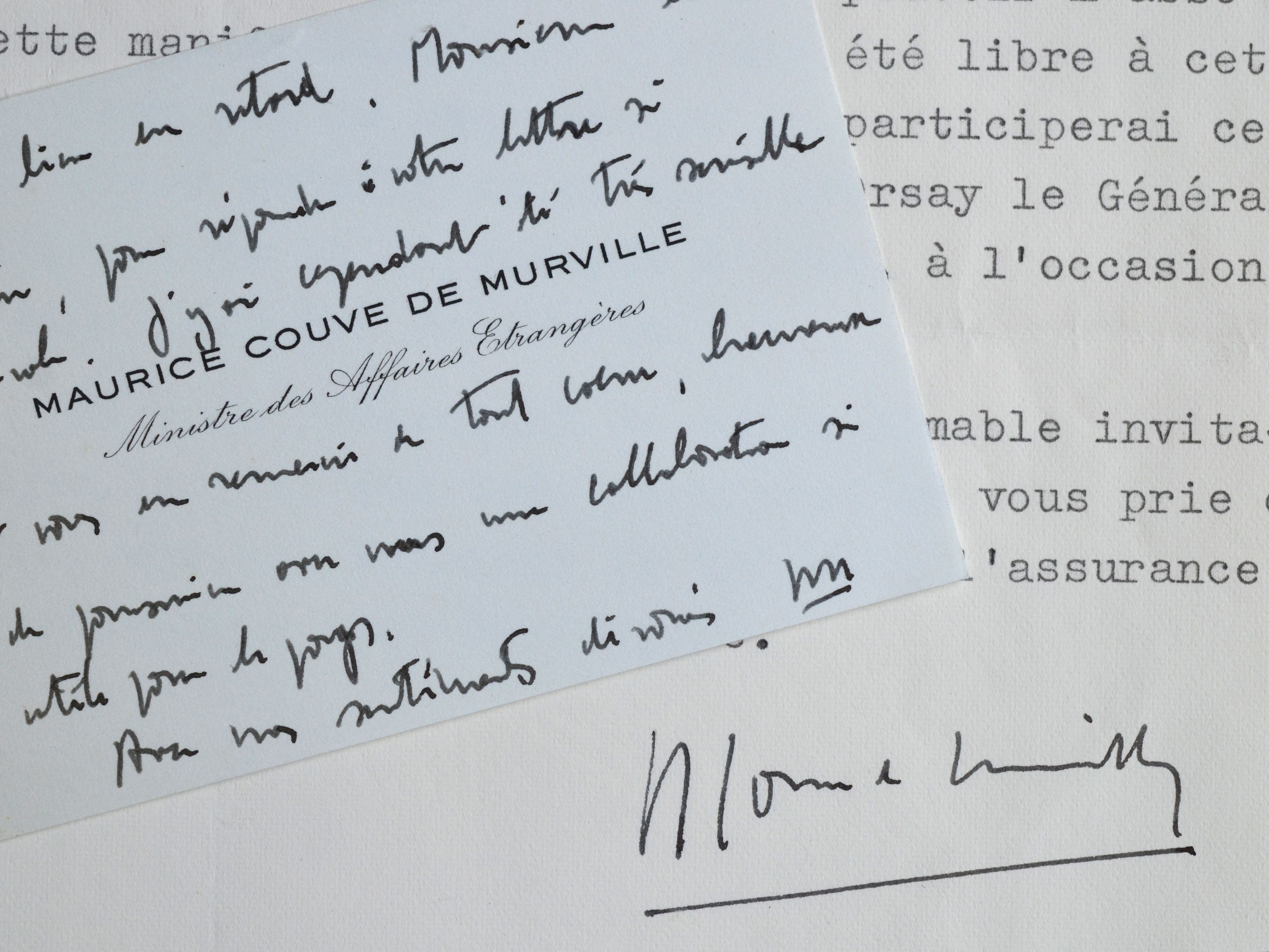 Couve de Murville, alors ministre des Affaires Etrangères, répond à l'invitation de Jean Roche d'assister à la soirée d'hommage à Miguel Angel Asturias. "J'aurais vivement souhaité pouvoir m'associer à cette manifestation si j'avais été libre à cette date. Ce n'est pas le cas puisque je participerai ce soir-là au dîner qu'offrira au Quai d'Orsay le Général Aref, président de la République d'Irak, à l'occasion de son voyage officiel en France [...]". Il est joint une carte de visite autographe signée, au même, s'excusant de son retard et se disant "heureux de poursuivre avec vous une collaboration si utile pour le pays".