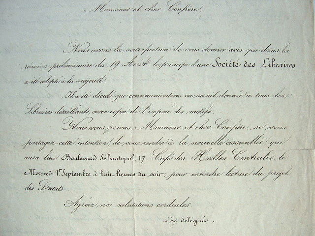Prospectus du projet de création de la Société des Libraires, avec exposé des principales motivations. "1° D'être représentés, s'il est nécessaire, près de la Commission Supérieure nommée par le gouvernement, pour étudier les questions relatives à la Librairie. 2° Détruire l'isolement commercial de nos maisons [...]".