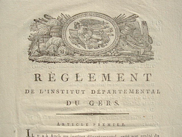 "Règlement de l'Institut départemental du Gers", créé par arrêté le 1er prairial an 9 [sur le modèle de l'Institut national] "dont l'objet est de concourir aux progrès des sciences, des lettres et des arts". Les statuts sont déclinés en 42 articles. A la fin, est dressée la liste des membres, divisée en trois classes (sciences physiques et mathématiques, sciences morales, littérature et beaux-arts).
