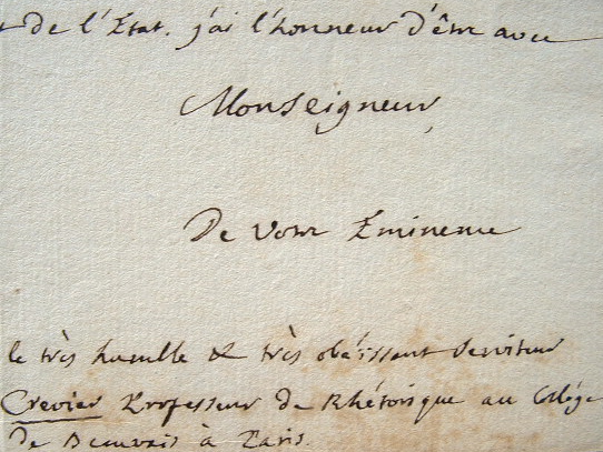 Jean Baptiste Louis Crévier (Paris, 1693/1765)Crévier adresse au cardinal de Fleury le nouveau volume de l'Histoire Romaine de Rollin [de son vivant, ce dernier ne fit paraître que les 5 premiers (1738-1741) ; l'entreprise fut achevée par Crévier qui publia les 8 derniers jusqu'en 1748]. «Voici le troisième volume de M. Rollin, depuis huit mois que j'ai l'honneur d'offrir à Votre Eminence. C'est le huitième de tout l'ouvrage. Celui-ci n'a point été revu par l'auteur. Ainsi j'ai été obligé de prendre sur moi le travail de la révision. Je n'ai rien épargné, Monseigneur, pour faire en sorte que ce qui est de moi dans ce volume ne déparât point l'excellent fond sur lequel je travaillois. Au moins, est-ce un grand honneur pour moi d'avoir quelque part dans l'hommage que j'en fais aujourd'hui à Votre Eminence [...]».