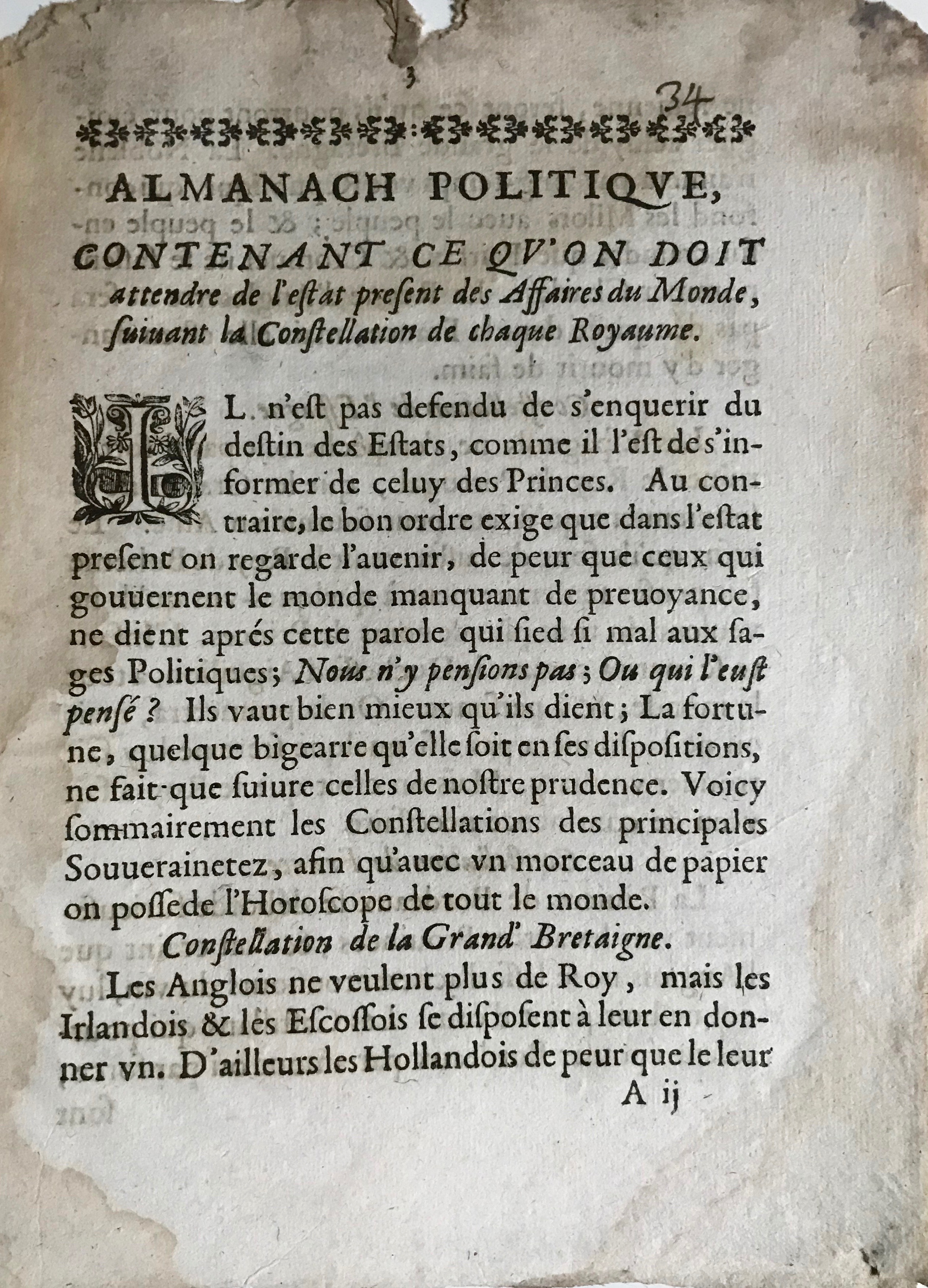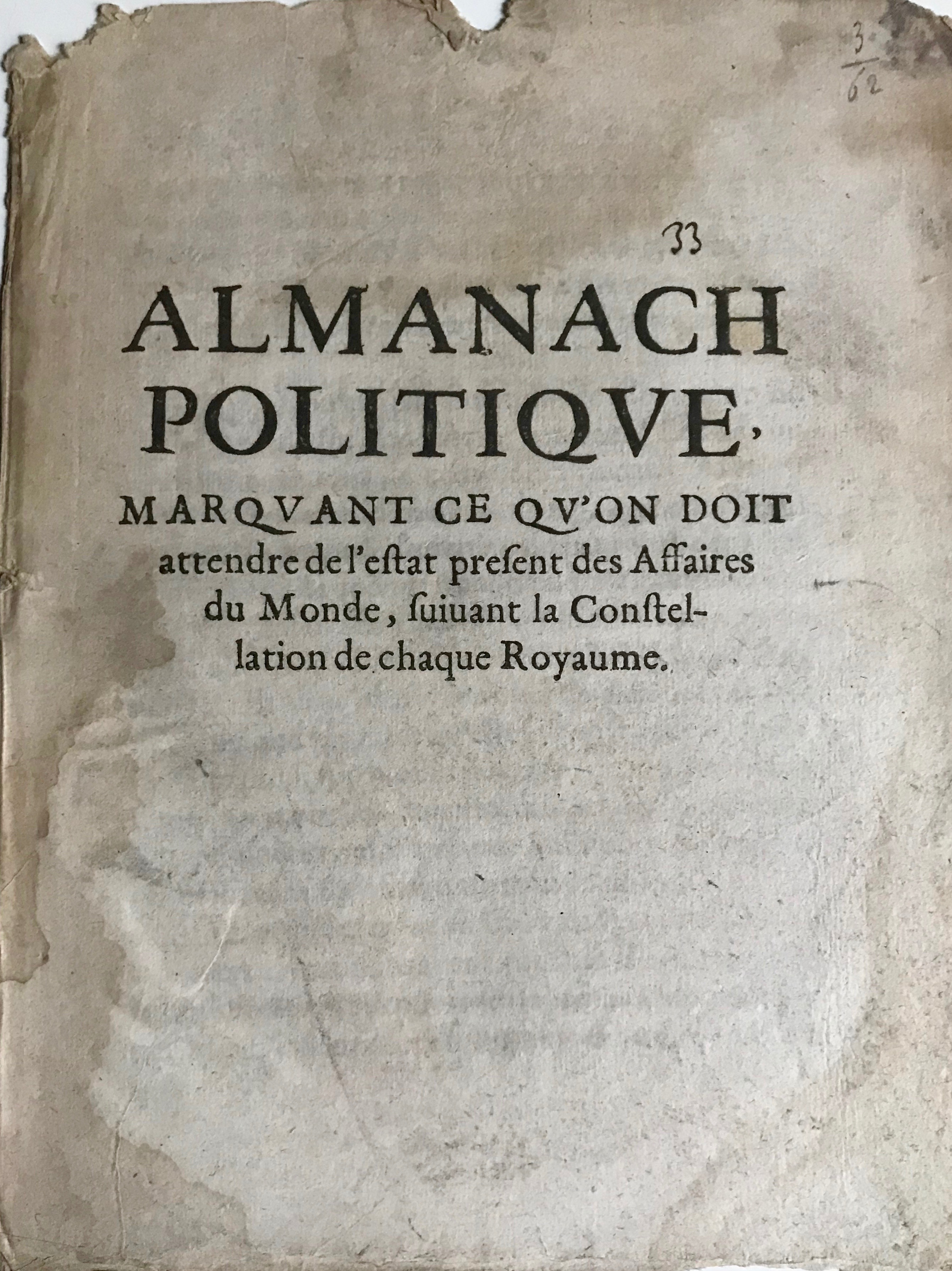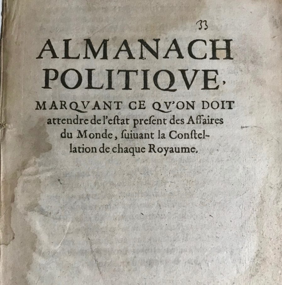 Curieux imprimé astrologique intitulé : "Almanach politique marquant ce qu'on doit attendre de l'estat présent des Affaires du Monde, suivant la constellation de chaque Royaume". Sans nom d'autres, ni lieu, ni date, ni imprimeur. Il est contemporain de la République anglaise de Cromwell.
