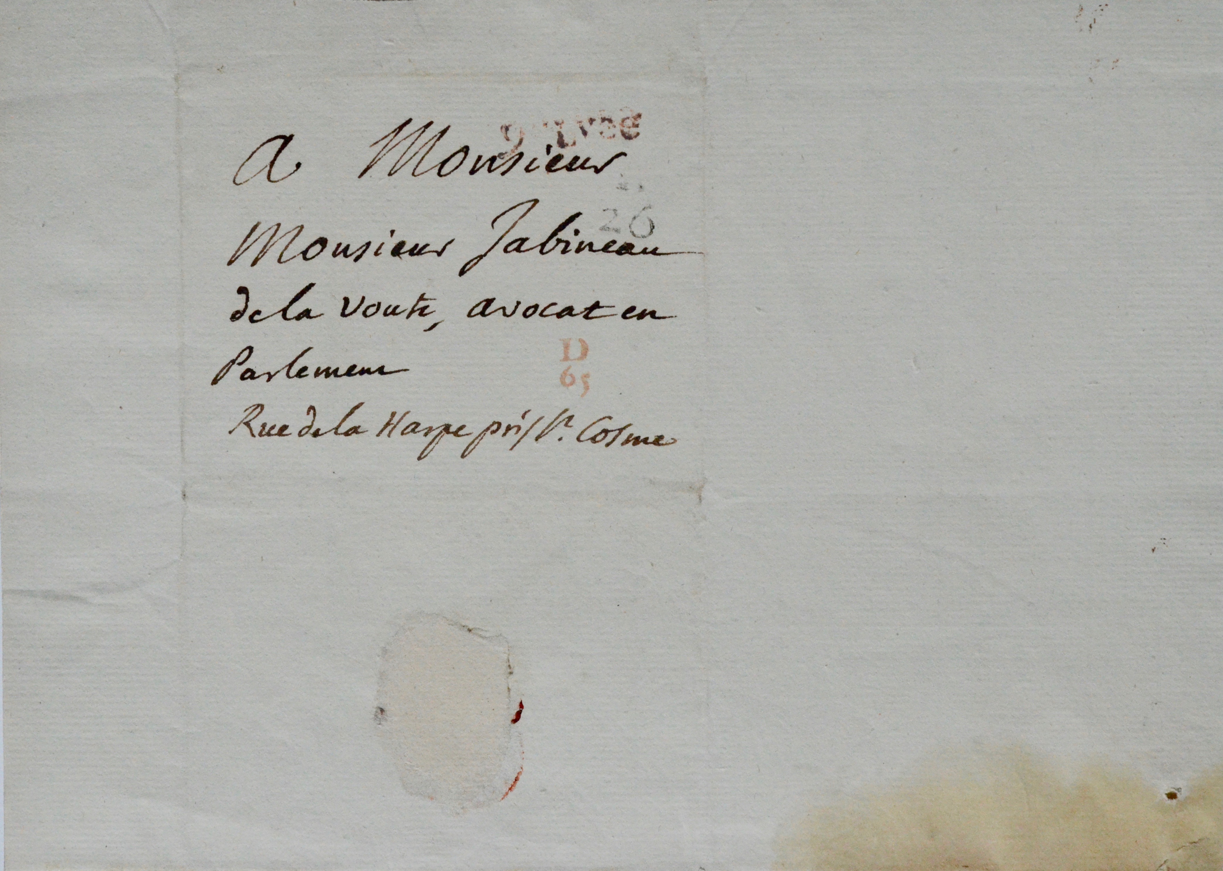 "L'Académie françoise, monsieur, n'étant point dans l'usage de conserver les lettres de remerciemens qu'on lui écrit, n'a point gardé celle de Mr. Colardeau que vous me faites l'honneur de me demander. Je m'en suis assuré particulièrement en feuilletant tous les papiers de la compagnie ; c'est ce qui a retardé de deux jours la réponse que j'ai l'honneur de vous faire. C'est avec bien du regret que je ne puis satisfaire le désir que vous avez de faire usage de cette lettre, qui étoit en effet, comme vous le dites, l'expression d'une âme sensible et reconnoissante [...]".