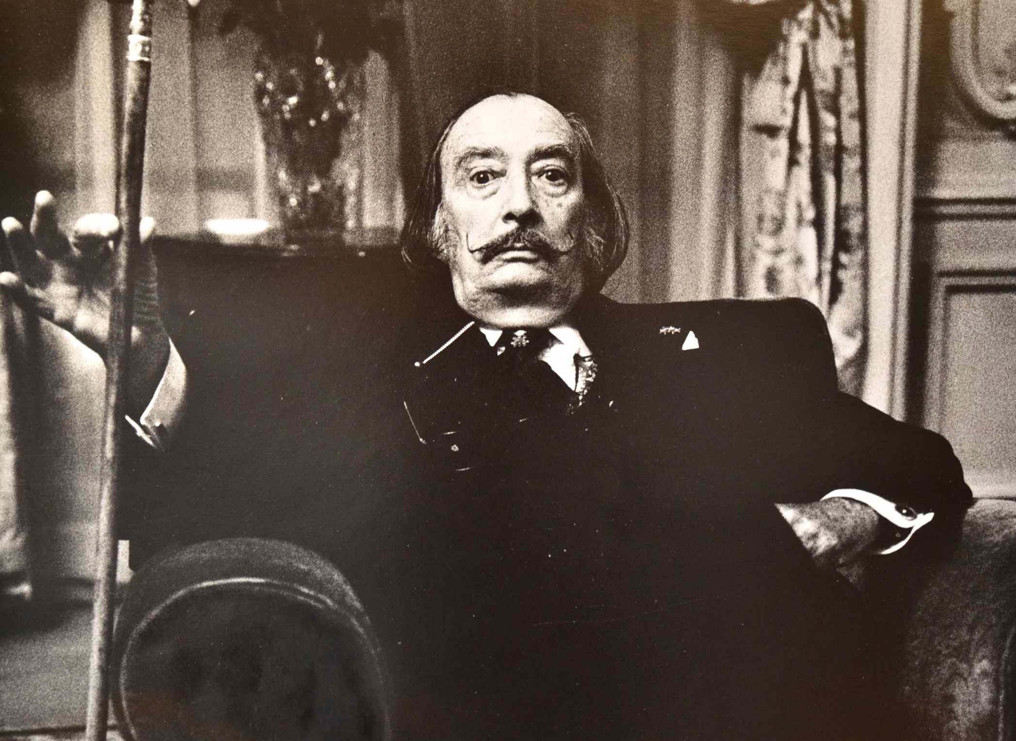 L'excentrique Dali photographié dans un fauteuil de l'hôtel Meurice, en avril 1977. Grand portrait en noir et blanc réalisé par Bruno de Monès. Photographie signée par son auteur, et numérotée 1/30, à la mine de plomb, eu dos. Très beau portrait.