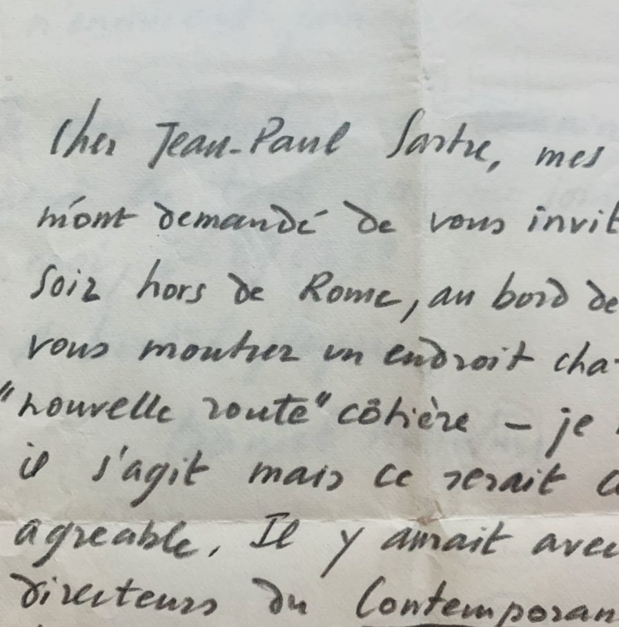 Daniel Anselme (Paris, 1927/1989)De séjour à Rome, Daniel Anselme invite Jean-Paul Sartre à dîner en compagnie des hommes de lettres italiens Antonello Trombadori, Carlo Salinari, directeurs de la revue Il Contemporaneo fondée 4 mois plus tôt. C'est dans cette revue culturelle financée par le parti communiste que Daniel Anselme donnera une interview en août 1954. « Cher Jean-Paul Sartre, mes amis du Contemporaneo m'ont demandé de vous inviter à aller diner demain soir hors de Rome, au bord de la mer. Ils veulent vous montrer un endroit charmant ainsi que la « nouvelle route » côtière je ne sais pas de quoi il s'agit mais ce serait certainement une soirée agréable. Il y aurait avec nous les deux directeurs du Contemporaneo, le critique d'art Antonello Trombadori et le critique littéraire Carlo Salinari, et deux personnages tout à fait exceptionnels, le député Giancarlo Pajetta, membre du bureau politique du parti communiste, qui est sans doute le dirigeant communiste le plus spirituel que je connaisse, et Mario Alicata, député de Calabre, qui vous racontera, si vous le pressez un peu, les deux duels à l'épée qu'il vient d'avoir à Naples avec l'autorisation du secrétariat du parti. Je leurs ai dit que vous preniez ici des vacances, et ils ont promis de respecter la trêve ; c'était d'ailleurs inutile car ils n'ennuient jamais. » Cette lettre a été adressée à Sartre le 14 juillet 1954 alors que l'Humanité publiait le même jour un entretien avec Sartre dans lequel, de retour d'URSS, il affirmait que « le liberté de critique est totale en URSS » [Il reviendra sur cette affirmation vingt ans plus tard]. Dans un second billet, Daniel Anselme, qui ne parvient pas à joindre Sartre, lui demande de lui laisser un message à son hôtel. « J'ai essayé de vous téléphoner toute la matinée, mais le numéro n'a cessé d'être occupé. Si jamais je n'arrivais par à vous joindre cet après-midi, pouvez-vous laisser un message pour moi à votre hôtel ? »