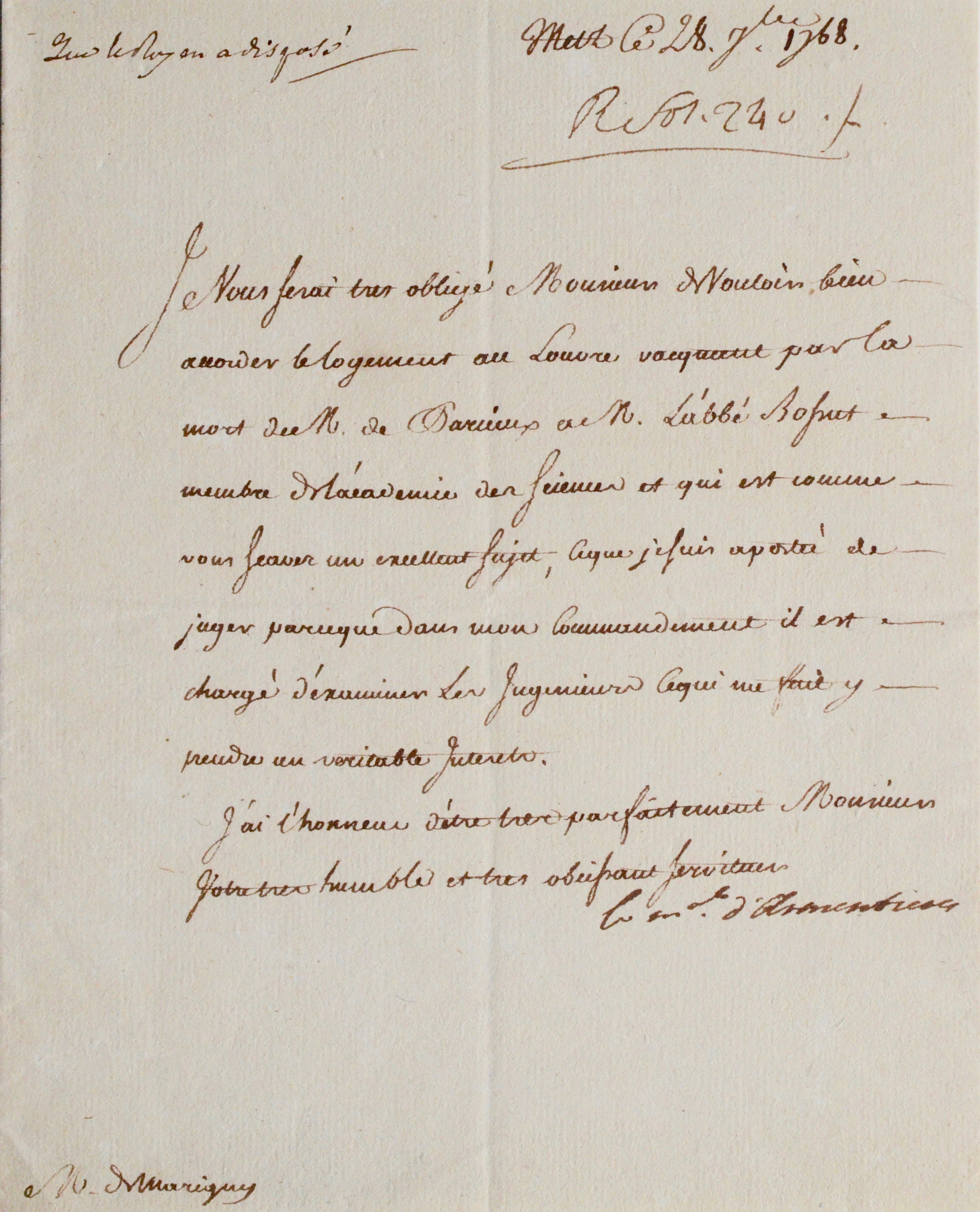 "Je vous serai très obligé, Monsieur de vouloir bien accorder le logement au Louvre vaquant par la mort de M. [Antoine] de Parcieux à M. l'abbé Bossut membre de l'académie des Sciences et qui est comme vous savez un excellent sujet, ce que je suis à portée de juger parce que dans mon commandement il est chargé d'examiner les ingénieurs ce qui me fait y prendre un véritable intérêt [...]".
