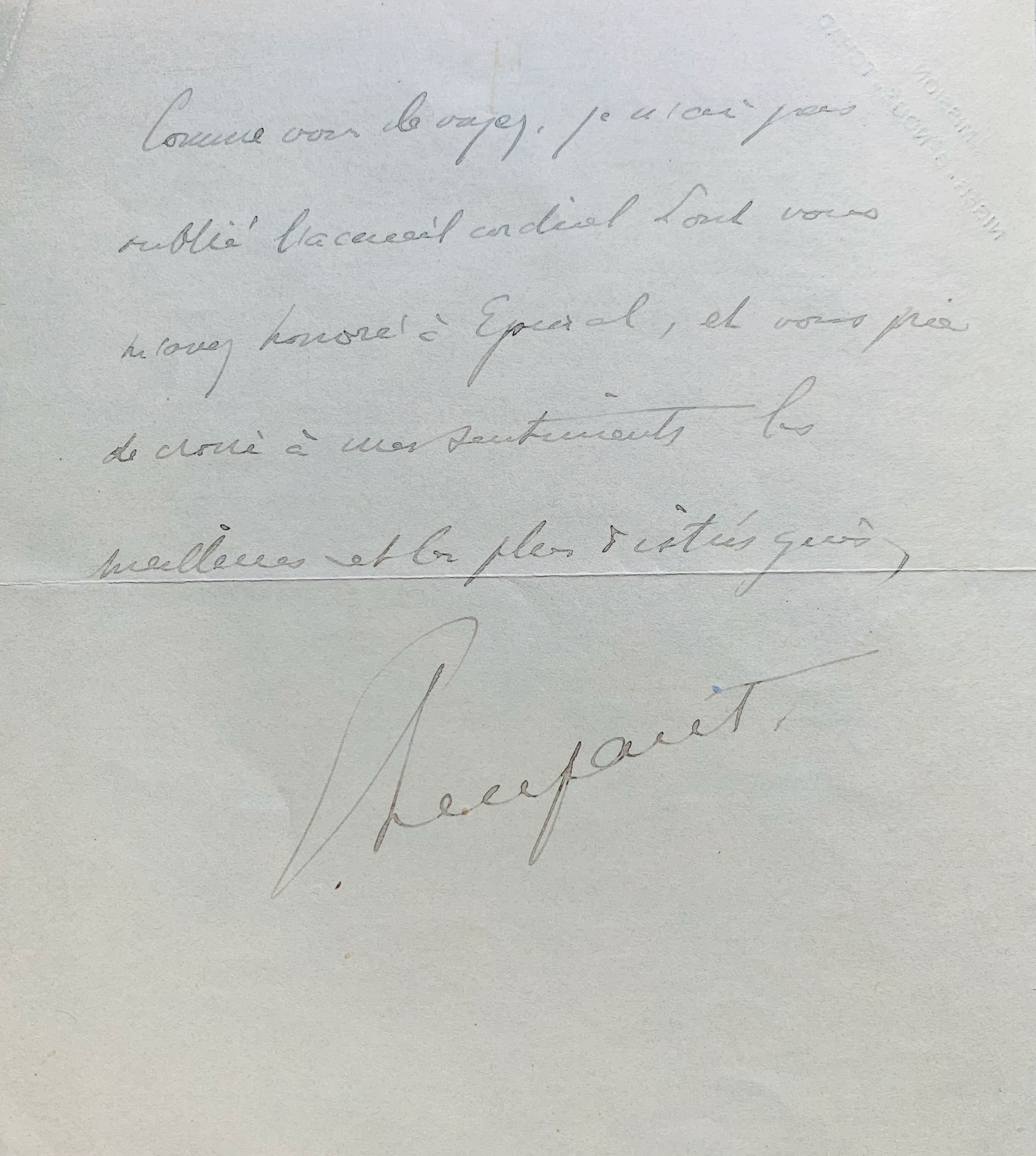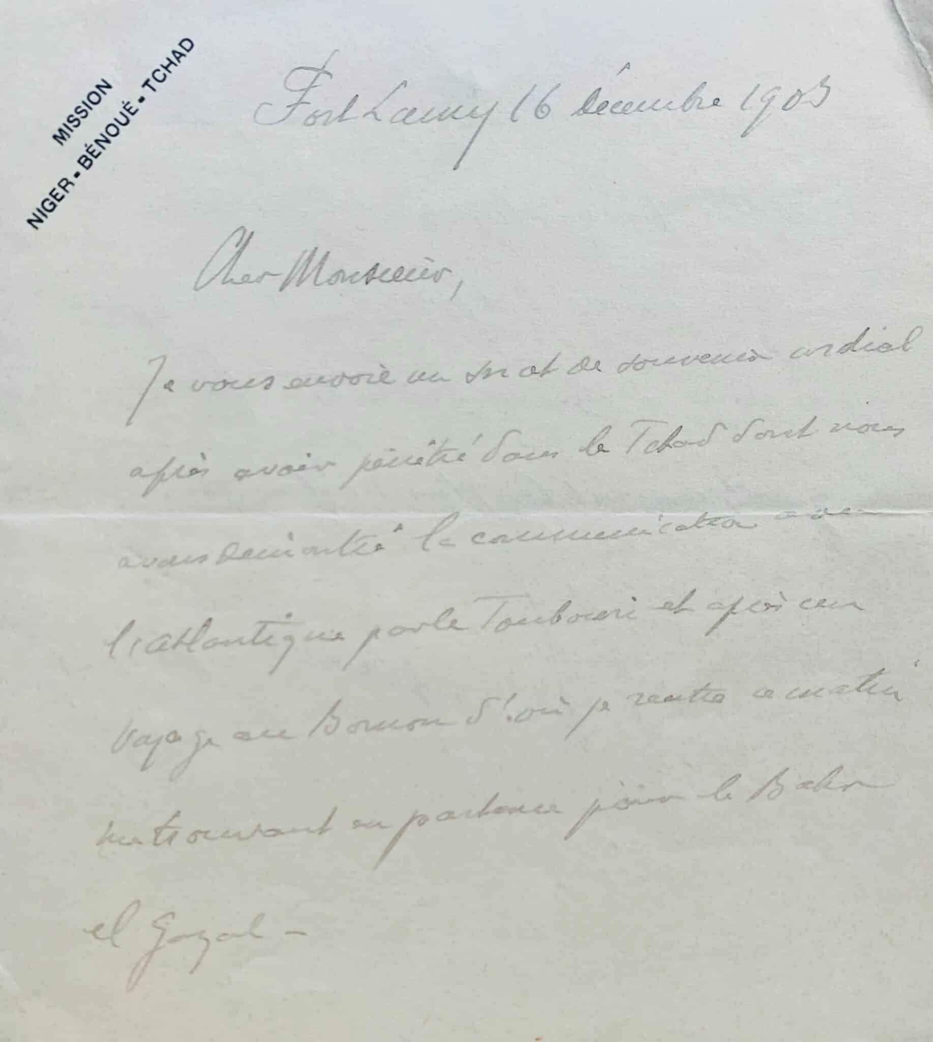 "Je vous envoie un mot de souvenir cordial après avoir pénétré dans le Tchad dont nous avons démontré la communication avec l'Atlantique par le Toubouri et après un voyage au Borkou d'où je rentre ce matin, me trouvant en partance pour le Bahr el-Gazal. Comme vous le voyez je n'ai pas oublié l'accueil cordial dont vous m'avez honoré à Epinal [...]".