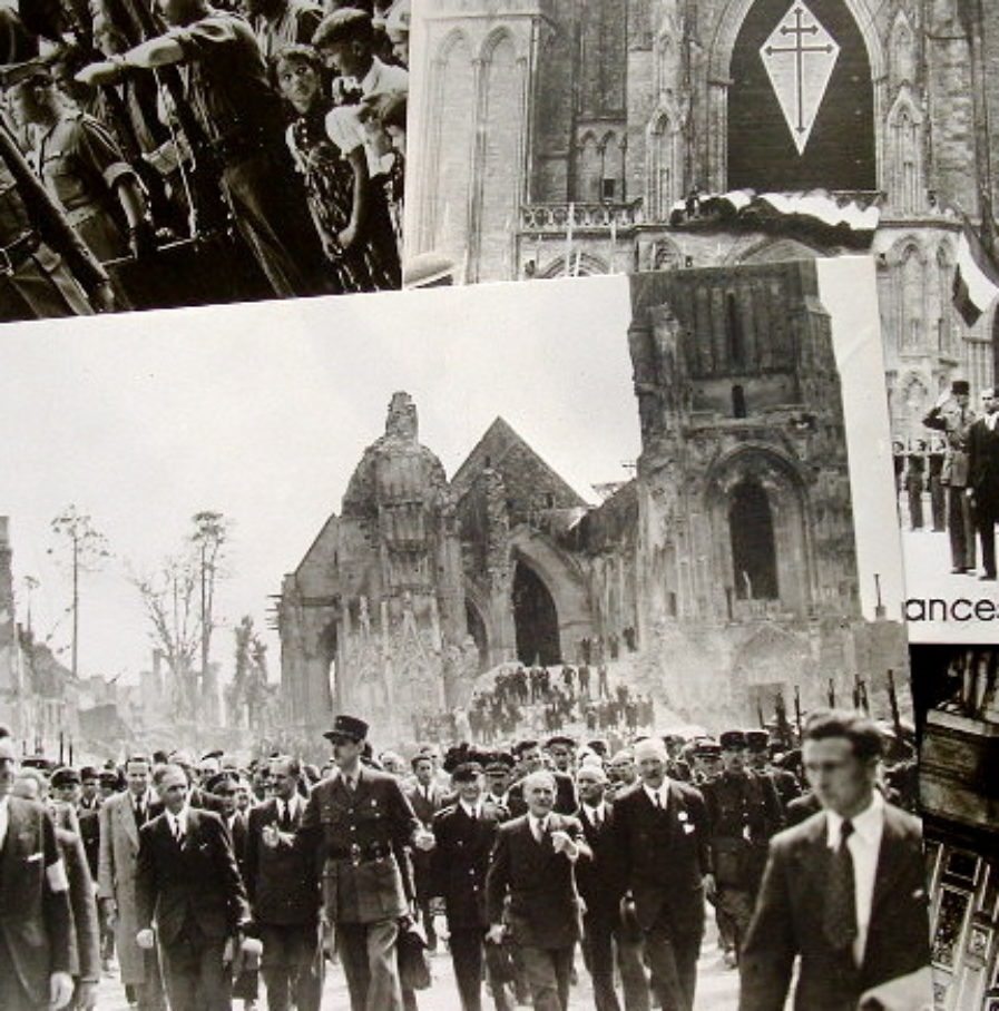 Deux tirages photographiques : De Gaulle en inspection dans le Tyrol autrichien et à la tribune de l'Assemblée consultative où il prononce un discours après la victoire.