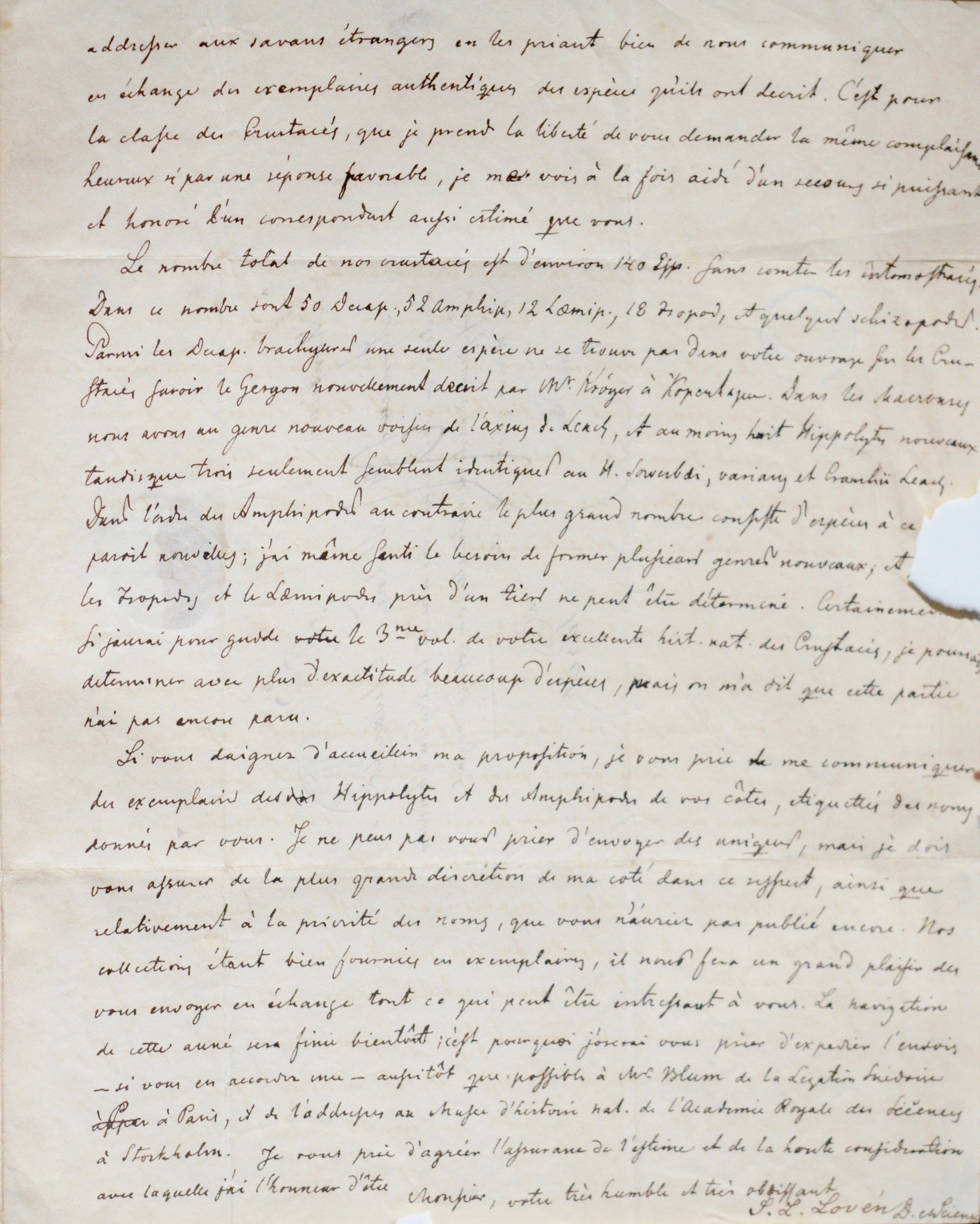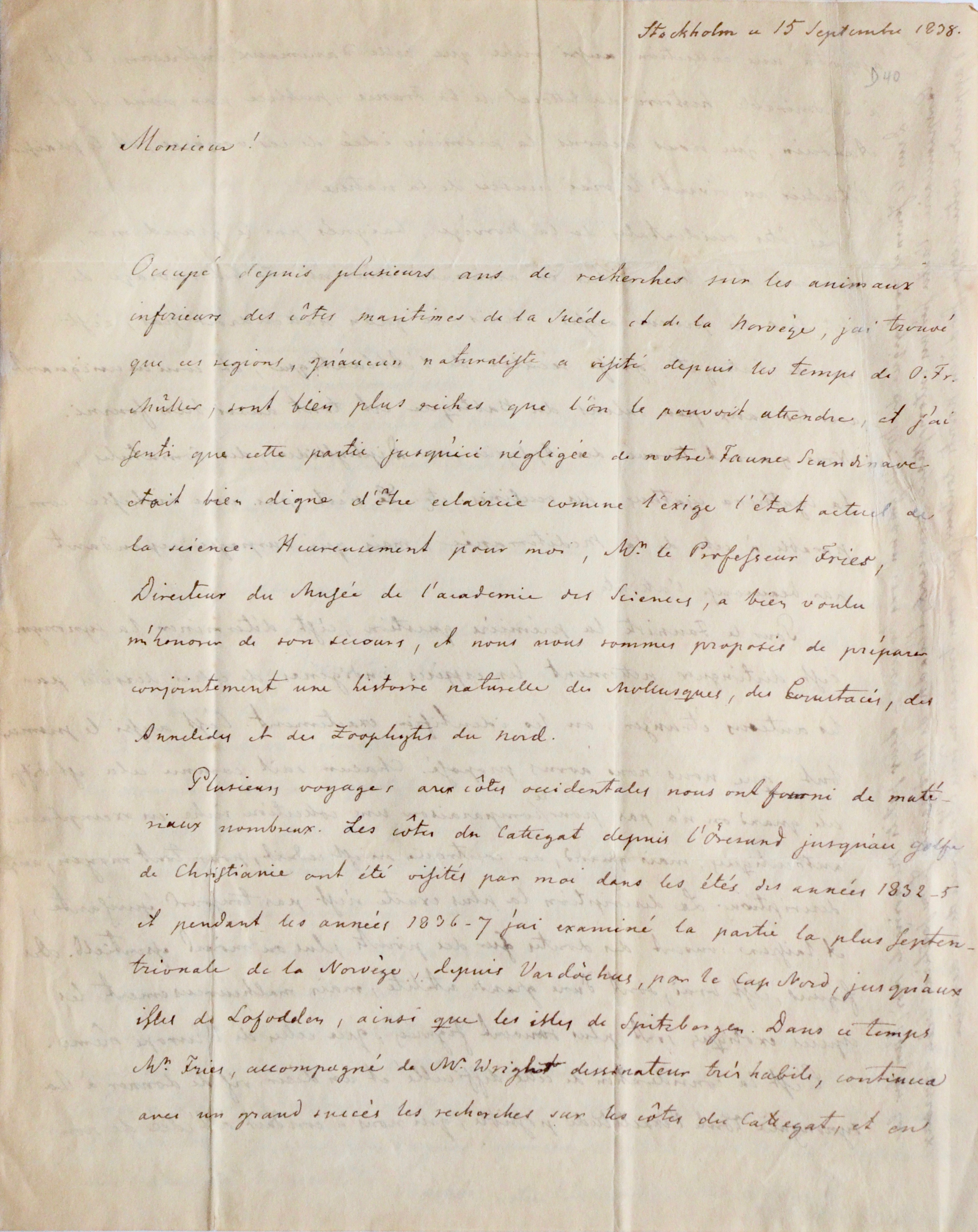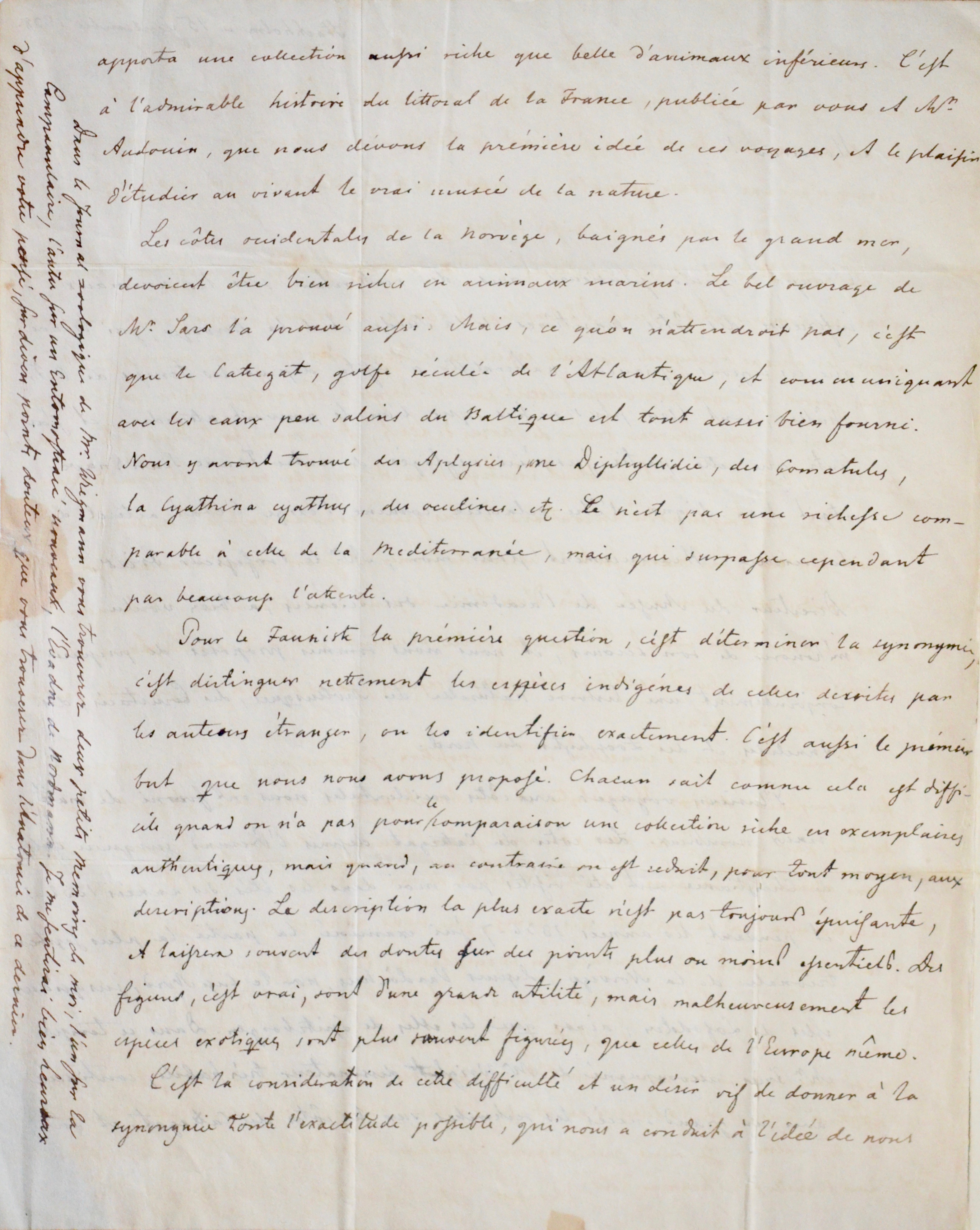 Importante lettre scientifique relative aux recherches que Lovén entreprit en collaboration avec le professeur Fries "sur les animaux inférieurs des côtes maritimes de la Suède et de la Norvège" en vue de "préparer conjointement une histoire naturelle des Molusques, des Crustacés, des Annélides et des Zoophytes du Nord".