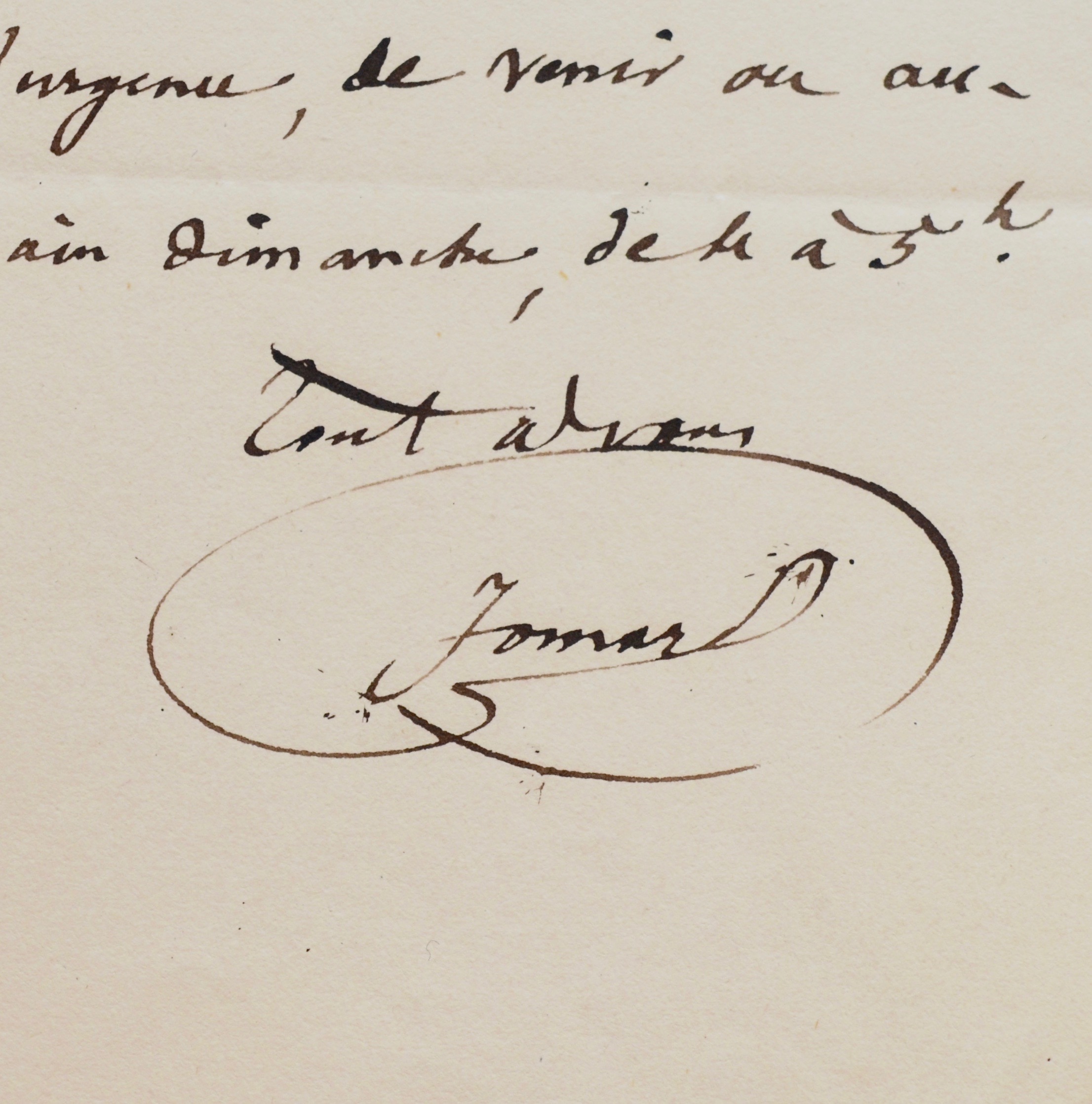 "Je dois voir M. de Montalivet lundi matin ; faut-il lui parler de l'affaire, et comment ? Il faudrait que je pusse vous voir, mais j'ignore comment on peut vous trouver après 11 heures puisque j'ai toujours échoué, par ma faute sans doute. J'ai moi, une heure fixe, tous les jours ; mais vous ne pouvez peut être [?] par raison de santé je le crains ; c'est sur les 5 heures (indépendamment des rendez-vous). cependant je vous propose, faute de mieux, et à cause de l'urgence, de venir ou aujourd'hui, ou demain dimanche, de 4h à 5h. [...]".