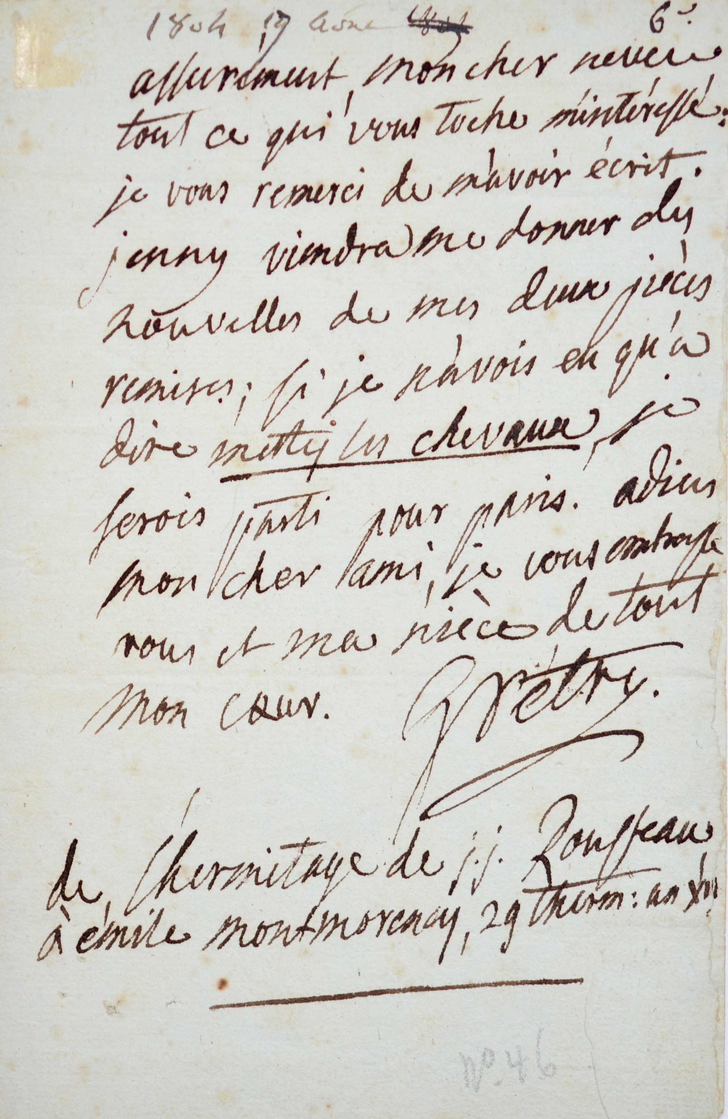 "De l'hermittage de J.J. Rousseau à Émile Montmorency" où il s'est retiré depuis une dizaine d'année, le compositeur Grétry remercie son neveu de lui avoir écrit. "Tout ce qui vous touche m'intéresse [...]. Jenny viendra me donner des nouvelles de mes deux pièces remises ; si je n'avois eu qu'à dire mettez les chevaux, je serois parti pour Paris. Adieu mon cher ami, je vous embrasse vous et ma nièce de tout mon coeur".