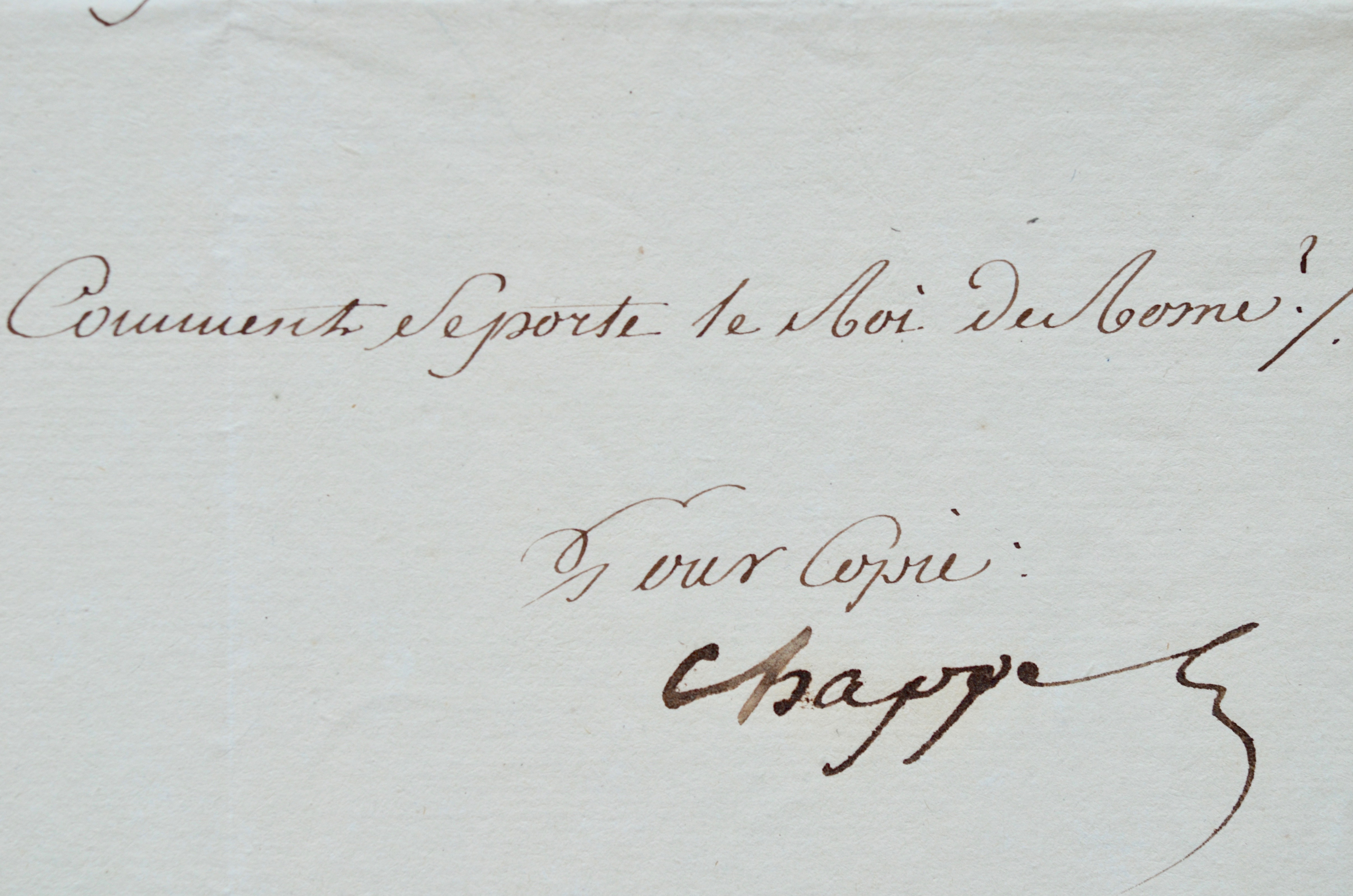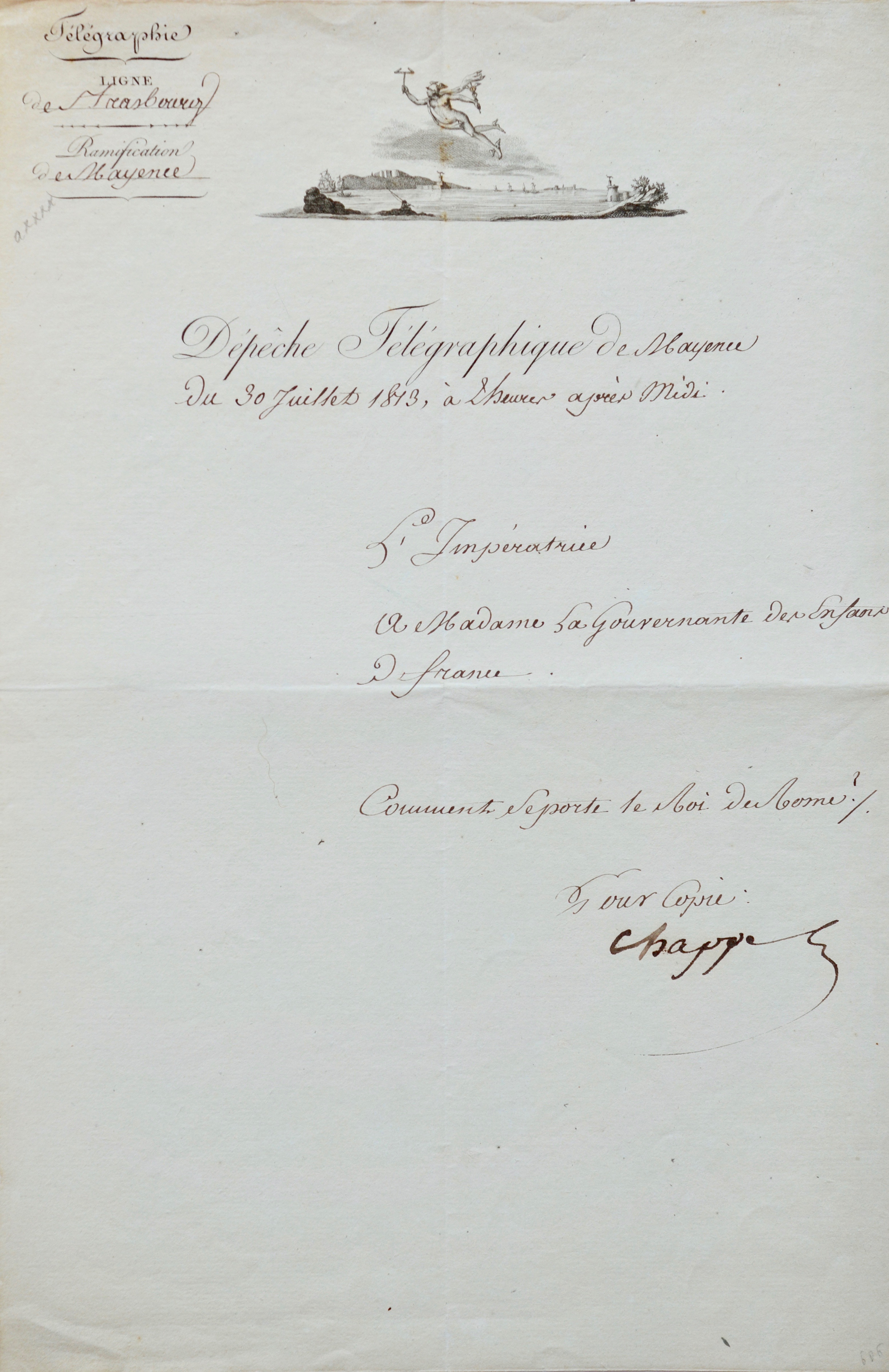 Emouvante dépêche télégraphique, signée par Chappe. "L'Impératrice à madame la gouvernante des Enfants de France [Mme de Montesquieu "maman Quiou"]. Comme se porte le Roi de Rome?".