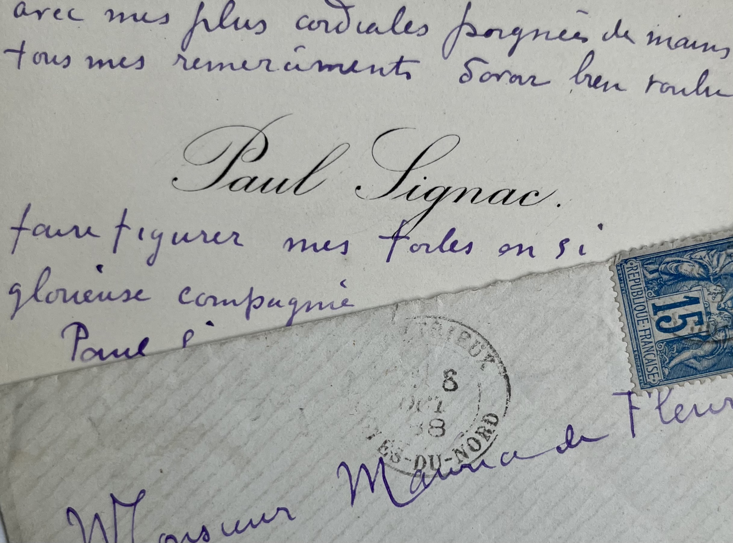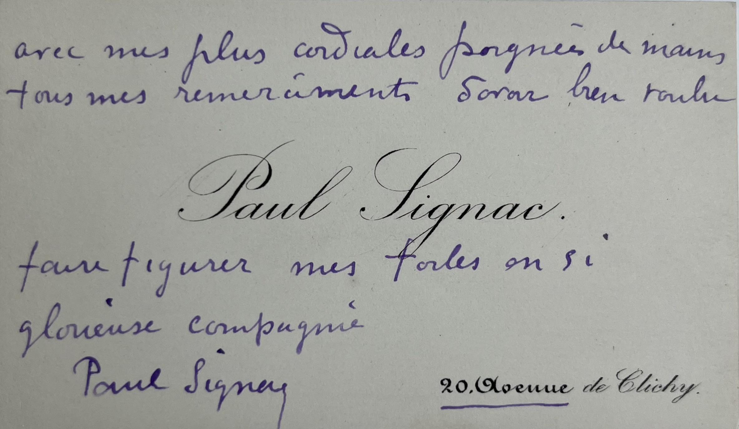 Sur sa carte de visite, Paul Signac, a écrit ces quelques mots : "Avec mes plus cordiales poignées de mains, tous mes remerciements d'avoir bien voulu faire figurer mes toiles en si glorieuse compagnie. Paul Signac".