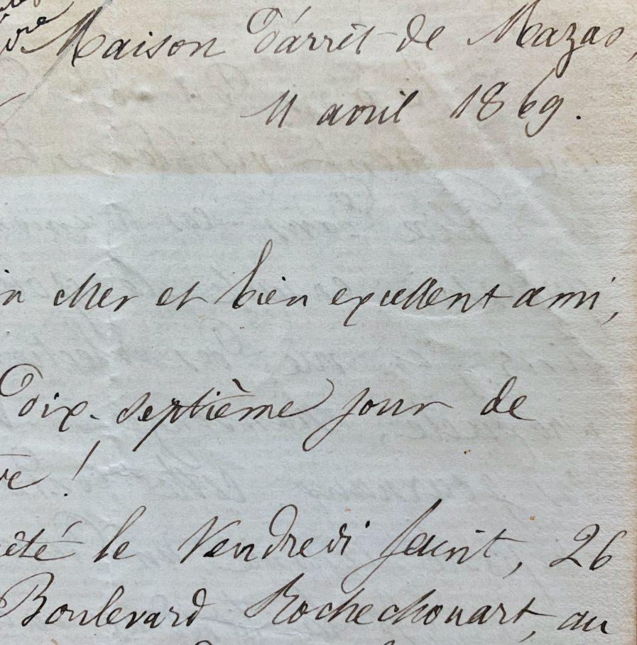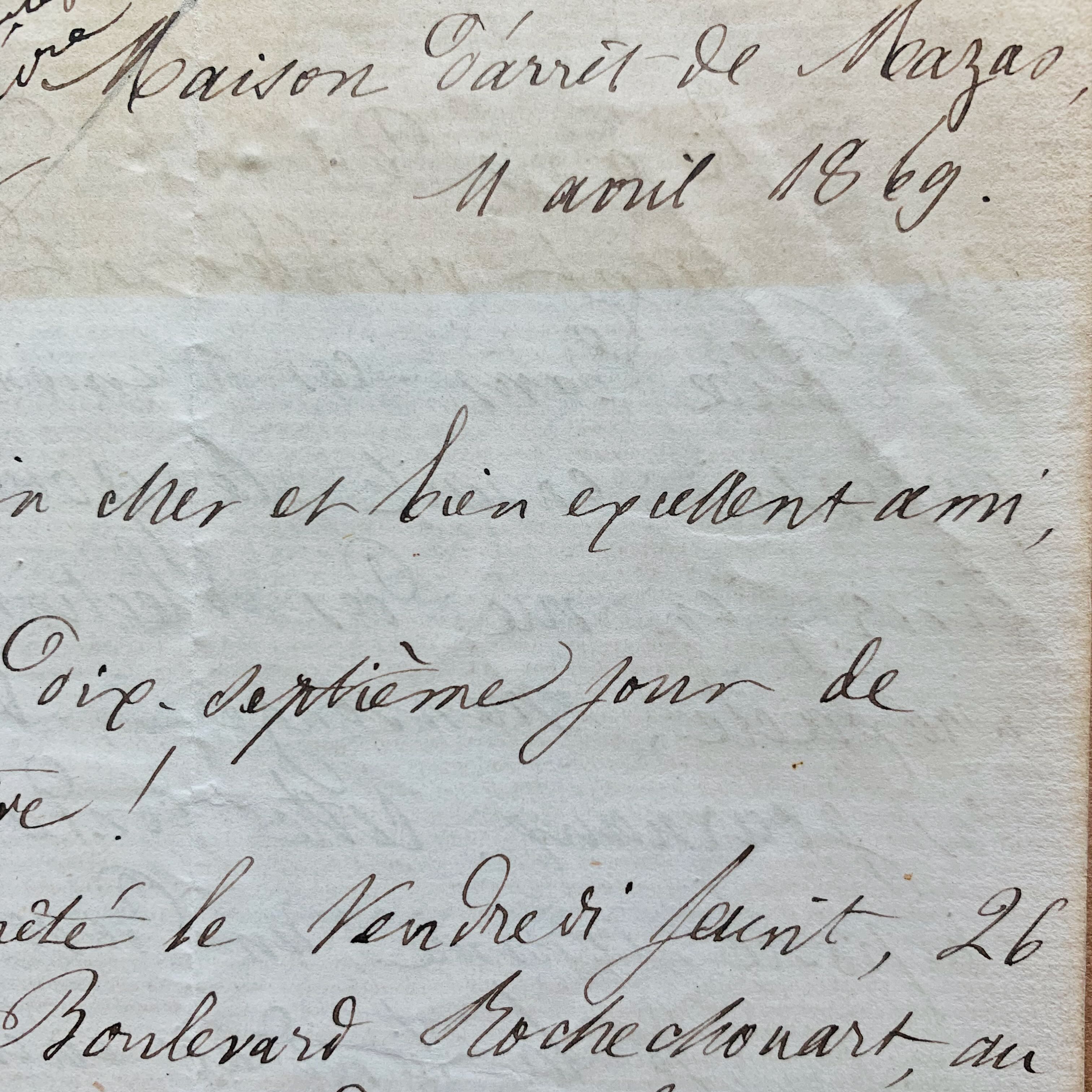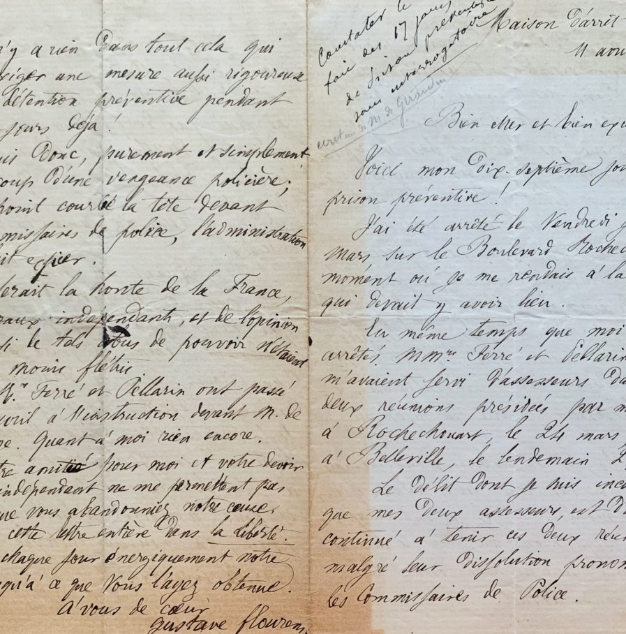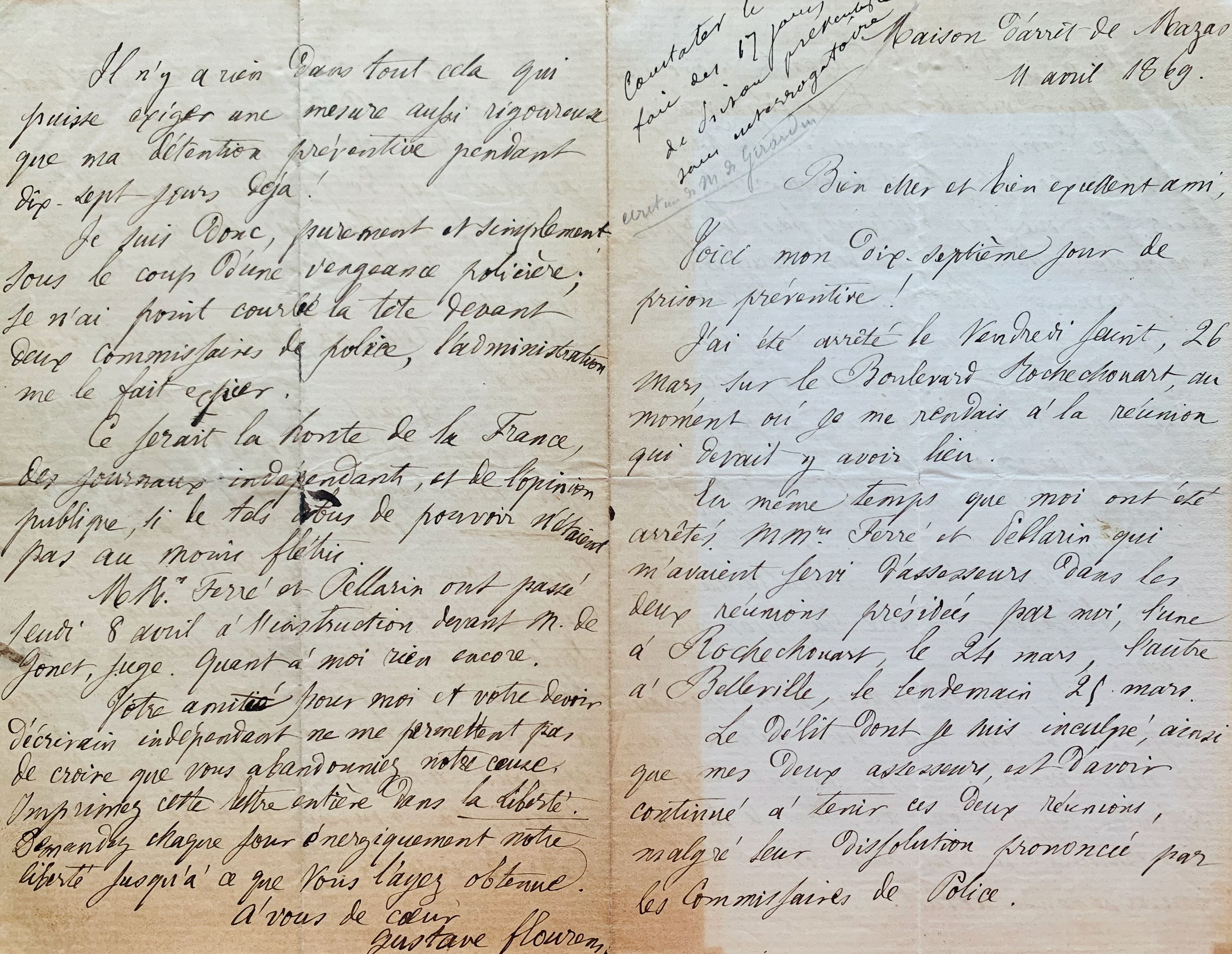 Gustave Flourens (Paris, 1838/1871)Longue et très intéressante lettre de Gustave Flourens, incarcéré de manière préventive pour son opposition politique au second Empire. Il demande à son ami Émile de Girardin de publier intégralement cette lettre dans La Liberté, journal que ce dernier a acquis trois ans plus tôt.