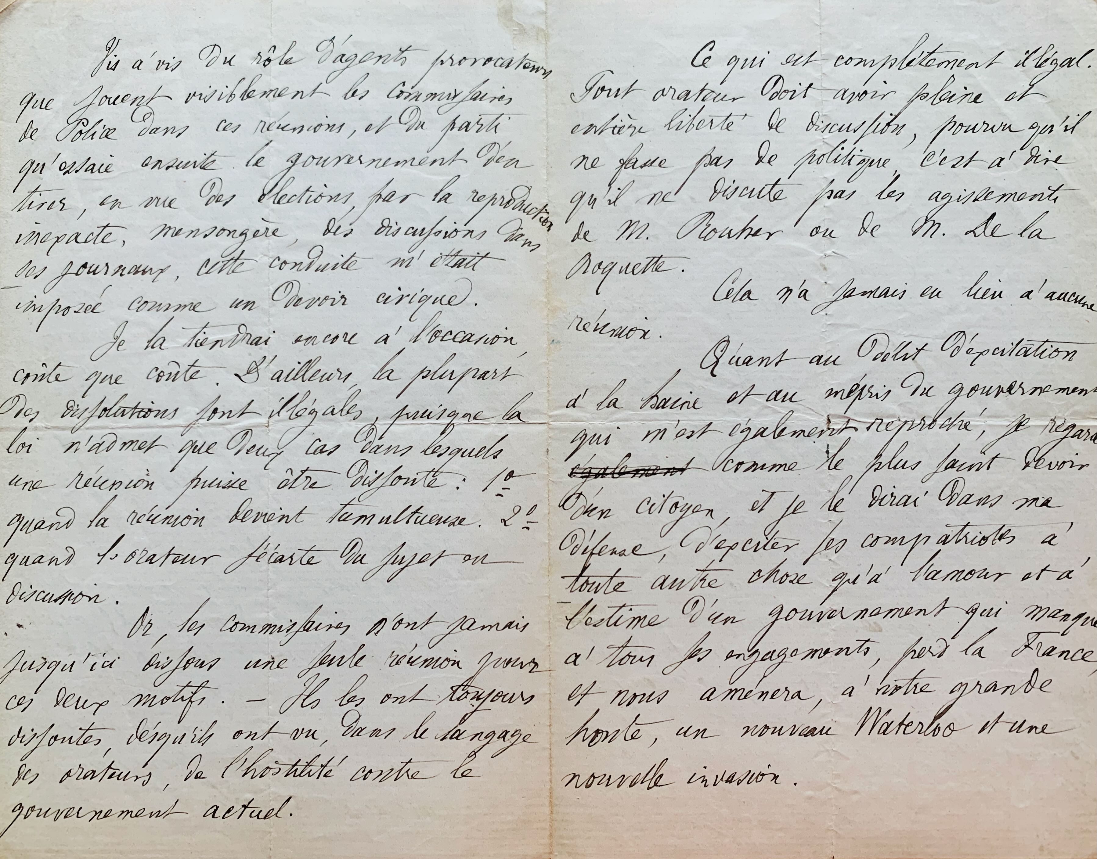 Je la tiendrai encore à l'occasion, coûte que coûte. D'ailleurs, la plupart des dissolutions sont illégales, puisque le loi n'admet que deux cas dans lesquels une réunion puisse être dissoute : 1° quand la réunion devient tumultueuse. 2° quand l'orateur s'écarte du sujet en discussion. Or, les commissaires n'ont jamais jusqu'ici dissous une seule réunion pour ceux deux motifs. Ils les ont toujours dissoutes, dès qu'ils ont vu, dans le langage des orateurs, de l'hostilité contre le gouvernement actuel [...]. Quant au délit d'excitation à la haine et au mépris du gouvernement qui m'est également reproché, je regarde comme le plus saint devoir d'un citoyen, et je le dirai dans ma défense, d'exciter ses compatriotes à toute autre chose qu'à l'amour et à l'estime d'un gouvernement qui manque à tous ses engagements, perd la France, et nous amènera, à notre grande honte, un nouveau Waterloo et une nouvelle invasion [...].