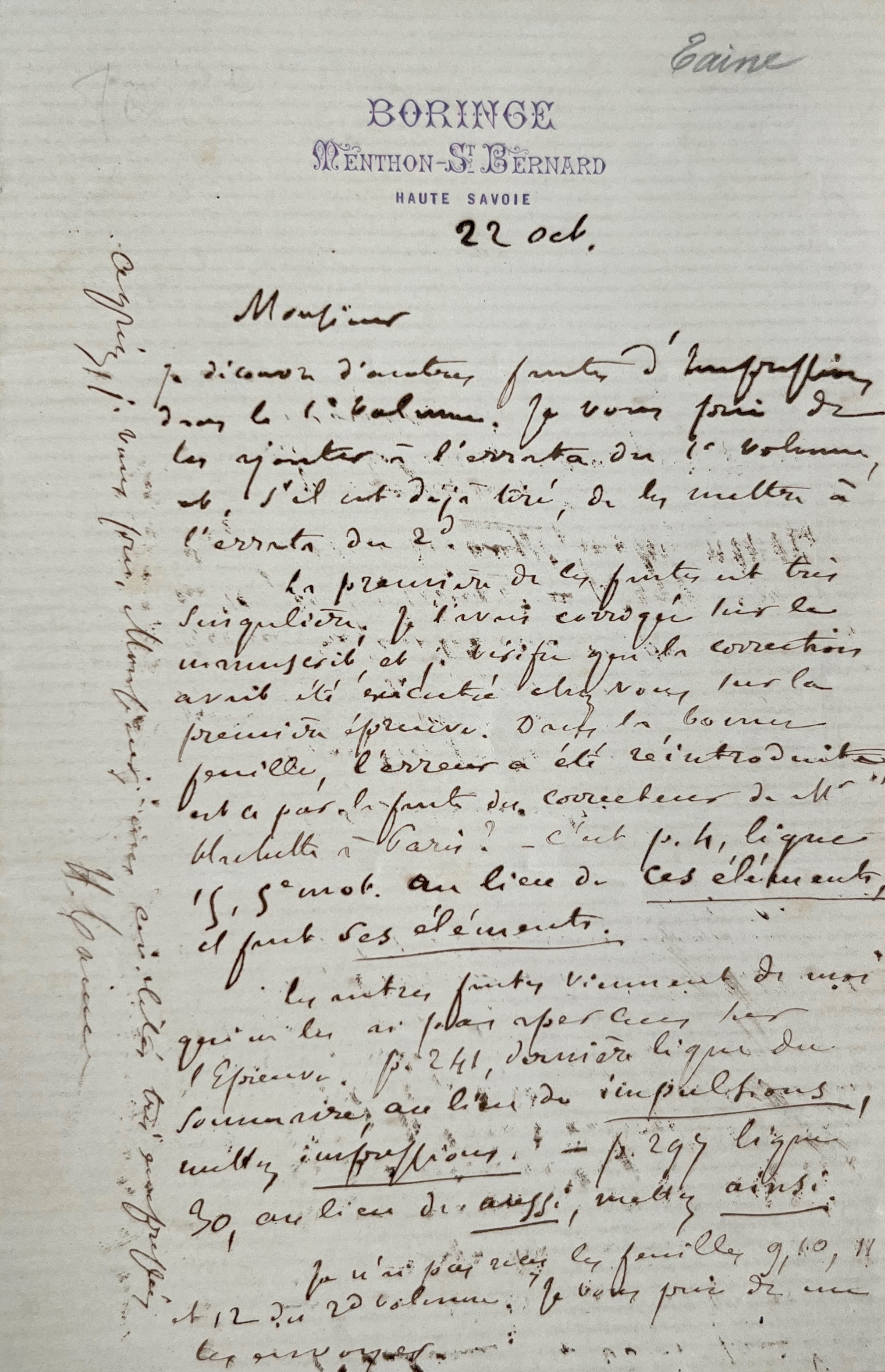 De sa propriété de Boringe à Menthon-saint-Bernard, Hippolyte Taine relève des erreurs d’impression