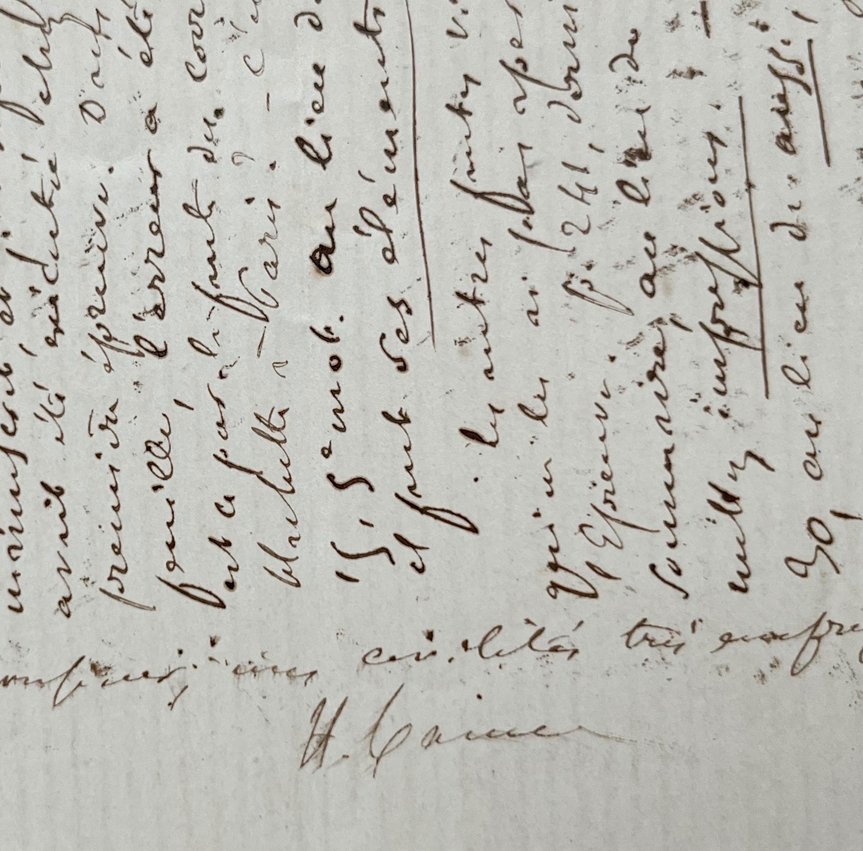 "Je vous prie de les ajouter à l'errata du 1er volume et, s'il est déjà tiré, de les mettre à l'errata du 2d". La première faute "ses éléments" au lieu de "ces éléments", avait déjà été corrigée par lui dans le manuscrit et a été réintroduite "est-ce par la faute des correcteurs de M. Hachette à Paris ?". Les autres fautes viennent de lui qui ne les a pas aperçues sur l'épreuve : le mot "impulsions" doit être remplacé par "impressions", page 241 et "aussi" doit être remplacé par "ainsi", page 297. Haine réclame enfin les feuilles 9 à 12 du second volume.
