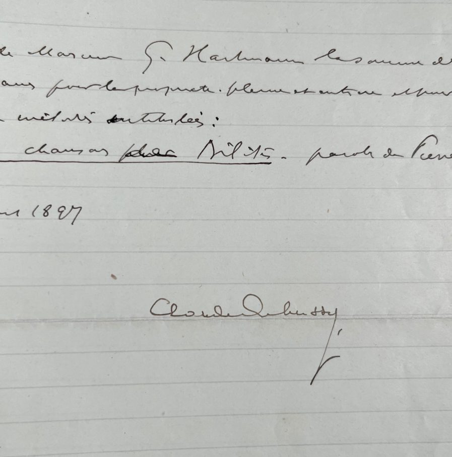 Reçu signé par Claude Debussy pour la cession de 2 des 3 chansons de Bilitis, cycle de mélodies composées en 1897-1898 sur les poèmes de son grand ami Pierre Louÿs.