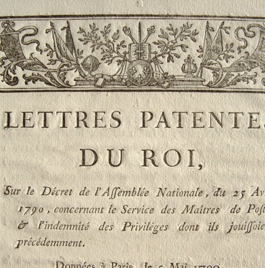 "Lettres patentes du Roi sur le décret de l'Assemblée Nationale, du 25 avril 1790, concernant le Service des Maîtres de Poste & l'indemnité des privilèges dont ils jouissaient précédemment".