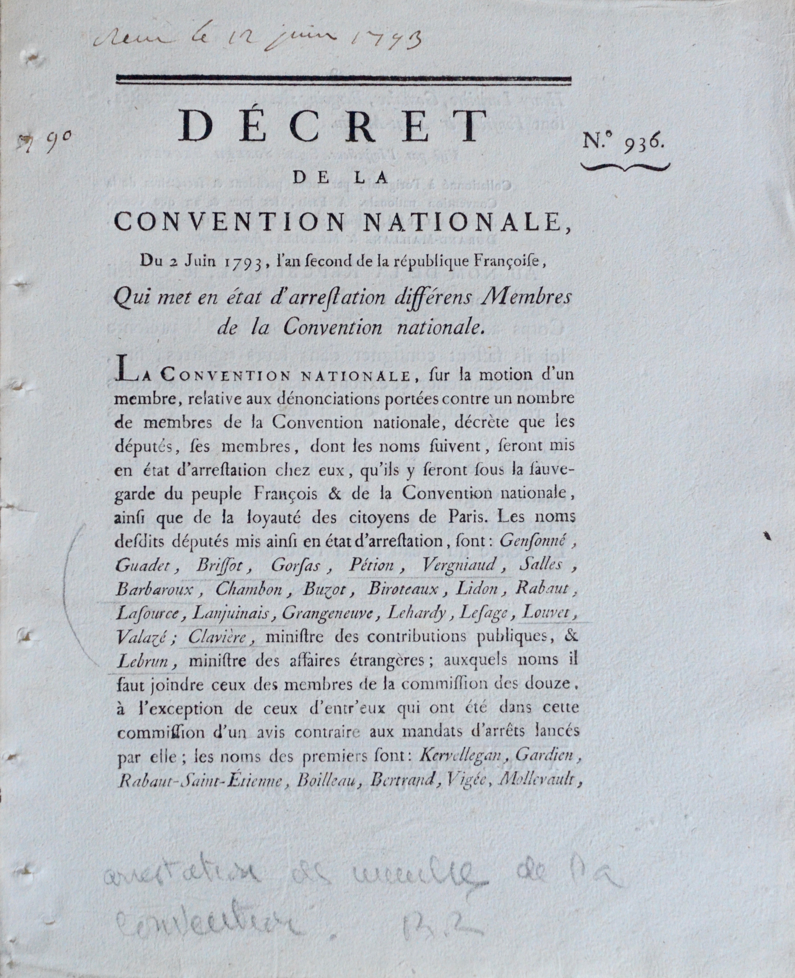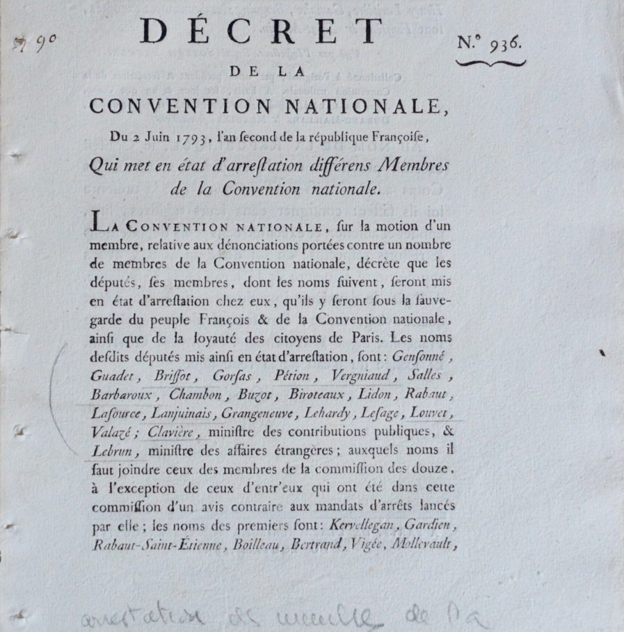 "Décret de la Convention nationale du 2 juin 1793 [...] qui met en état d'arrestation différent Membres de la Convention nationale". Suit une liste des 32 Girondins concernés : Barbaroux, Birotteau, Brissot, Buzot, Chambon, Gensonné, Gorsas, Grangeneuve, Guadet, Lanjuinais, Lasource, Lehardy, Lesage, Lidon, Rabaut, Louvet, Pétion, Salle, Valazé, Vergniaud, Clavière et Lebrun.