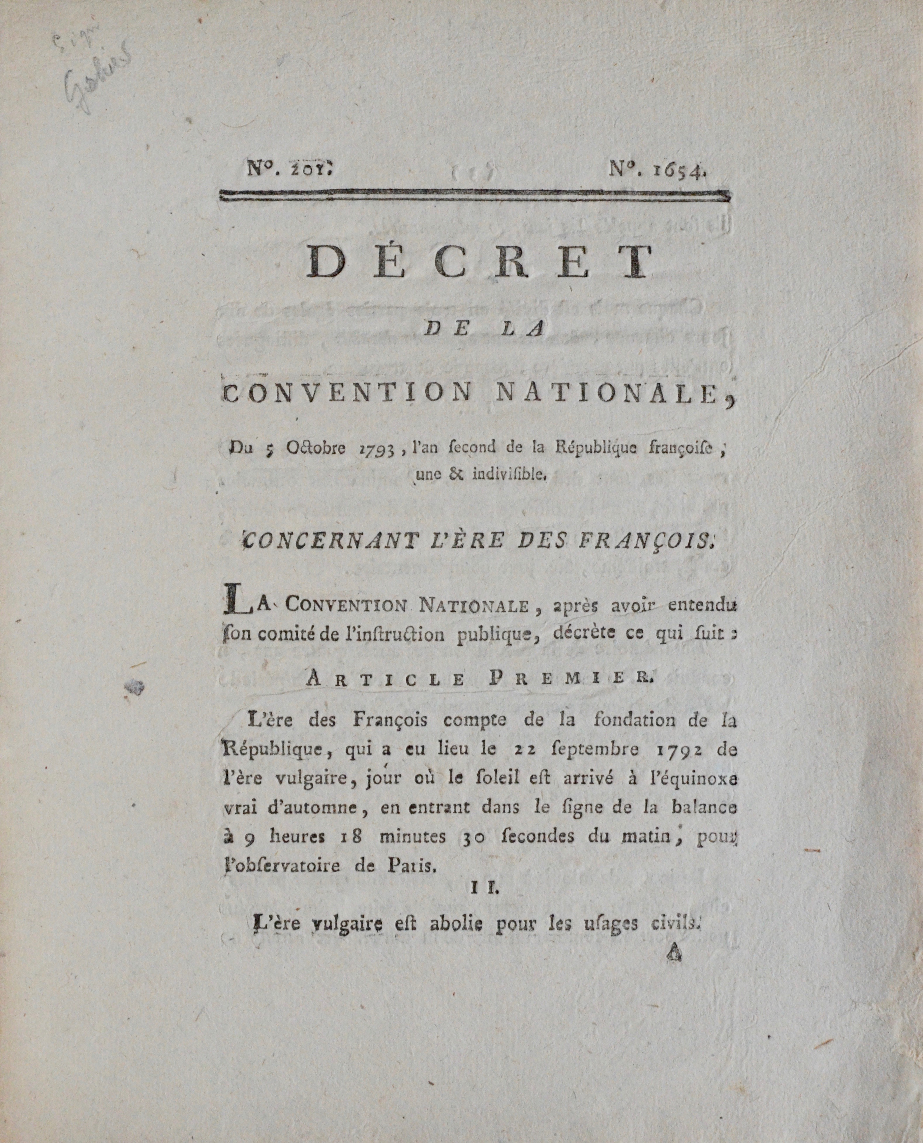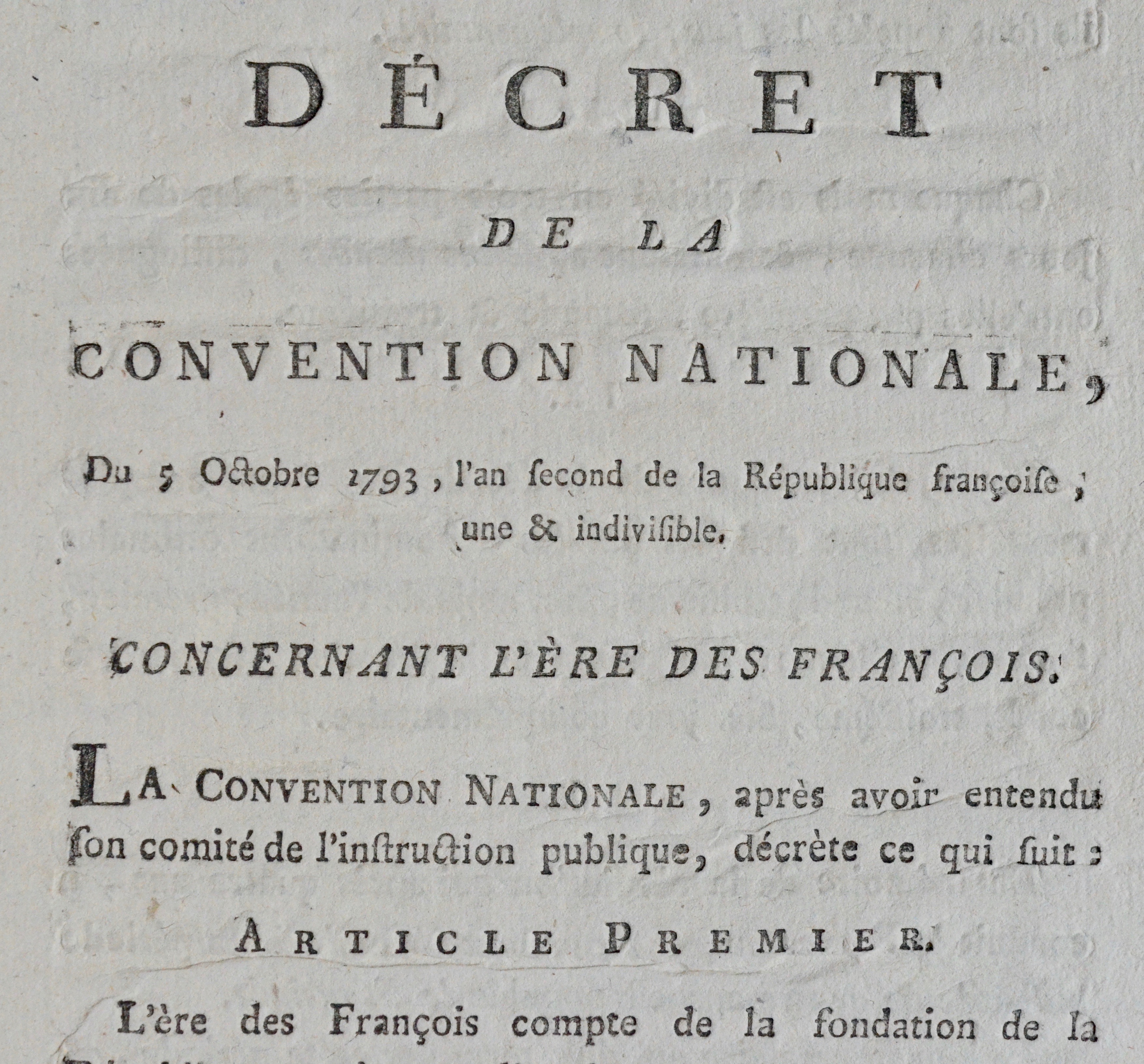 "Décret de la Convention nationale du 5 octobre 1793, l'an second de la République françoise, une & indivisible concernant l'ère des françois".